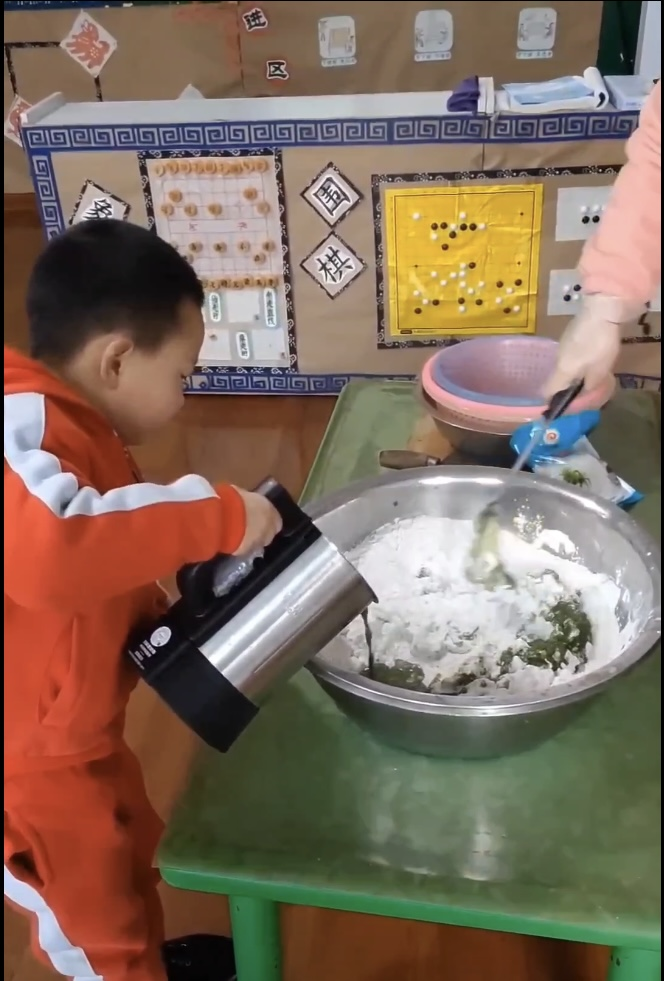 活动中,幼儿园教师带领孩子们上山认识野菜、采摘野菜,回园后,对摘采的野菜经过筛选、清洗、浸泡、焯水、切碎、榨汁、揉糯米团等多道工序,制作出美味的“野菜粑粑”。