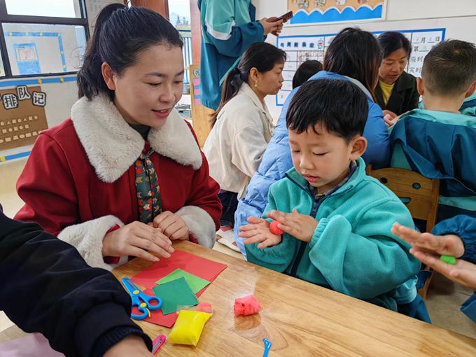 该园教师根据班级实际情况,向家长总结了上学期幼儿在园表现,并对新学期根据幼儿年龄特点,孩子在幼儿园能达到什么样的目标提出了合理期望。家长会结束后,孩子与家长一起进行亲子手工制作。