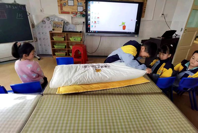 看!江南镇中心幼儿园的logo整整齐齐地躺在被子上,好像在看谁把它叠放的最好看。