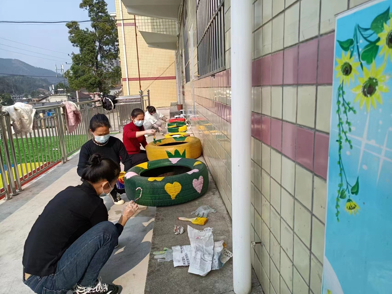 本网讯 2月27日,洞市幼儿园幼师利用午休时间,群策群力,开展“创意轮胎”彩绘活动,对园内废旧轮胎进行了美化。 老师们对轮胎进行细致的清洁,再借助刷子,对轮胎耐心地打上底色,在此基础上,自选绘画主题,利用画笔、颜料等工具在废旧轮胎上进行创作。你看!老师们拿起画笔在轮胎上“唰唰唰”,尽情地彩色涂鸦,给“轮胎宝宝”穿上了富有创意的新装:“小乌龟”“草莓”“五角星”“甜甜圈”……一个个黑乎乎的废旧轮胎,经过老师们的清洁装饰,创意绘制,成功变身,都披上了颜色鲜明、色彩和谐、富有童趣的图案。 “创意轮胎”彩色绘画活动的开展,既促进了教师之间的交流,又装饰了幼儿园的环境,成了幼儿园一道富有特色的风景线。
