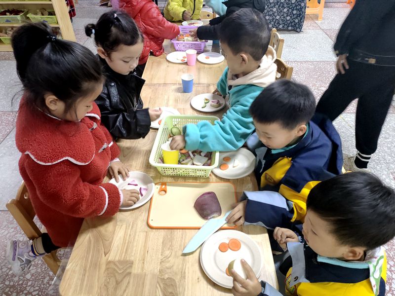 本网讯 日前,江南镇中心幼儿园设计了以萝卜为主题的食育教学活动,师幼与萝卜来一场亲密接触,共享“萝卜食育”的快乐与美妙。 “小白鞋,泥里踩,绿绸裤子,随风摆”猜一蔬菜,幼儿有的说是凉薯,有的说是土豆,有的说是萝卜,张建红老师用猜谜,表演情景剧《拔萝卜》,激化幼儿学习的乐趣。徐慧老师制作PPT,引导幼儿认识萝卜的种子、根、茎、叶及萝卜的生长过程,并通过动手制作,体验民间“秋收冬藏”的传统食俗——腌萝卜。廖彬老师引导幼儿摘洗萝卜、炸萝卜丸子、做萝卜拼盘、品尝萝卜,让幼儿体验制作美食的乐趣。罗巧英老师带领幼儿挖土、播种、施肥,在种植园忙忙碌碌种下满满的希望。活动中,老师们运用有效策略激发幼儿学习兴趣,营造了一个自主、合作、探究、实操的学习氛围。 该园抓住教育的契机,在萝卜成熟的季节,围绕“礼、知、操、趣”开展食育教学大练兵,培养了幼儿良好的饮食习惯,提高幼儿动手能力。