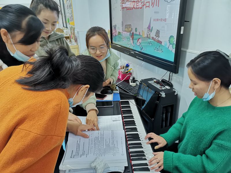 本网讯 “老师们,放学后记得要到小班活动室里来练琴哦…”11月14日,洞市幼儿园工会主任黄敏辉在孩子们都离园后通知老师们集中练琴。 自10月份以来,该园发出倡议:周一至周五所有老师利用幼儿离园后进行弹唱的练习。黄敏辉在老师们动手练琴前进行了理论培训:分别就演奏技巧、伴奏形式等方面进行了细致讲解,还结合各年龄段歌唱活动特点,指导教师根据歌曲的节拍、曲调、情感选择不同的和弦,并进行现场演示,让老师们在灵活多变的伴奏声中,感受不同风格的和弦伴奏所带来的美妙音律。到了老师们的实践操作时间,黄敏辉根据各个不同教师的能力布置相应的歌曲进行练习,老师们态度端正,非常好学,反复问、反复练,黄敏辉也会针对教师们在弹奏歌曲时存在的困惑问题,细致的进行指导,帮助教师们更好的掌握钢琴弹唱的技巧。 老师们在练习弹唱的过程中觉得轻松、有趣,又非常贴近教师需要,符合教师实际工作需求。大家纷纷表示:通过理论加实操的方式,解决了自己在音乐教学活动中弹唱内容的困惑,也让自己的基本功有了进一步的提升。