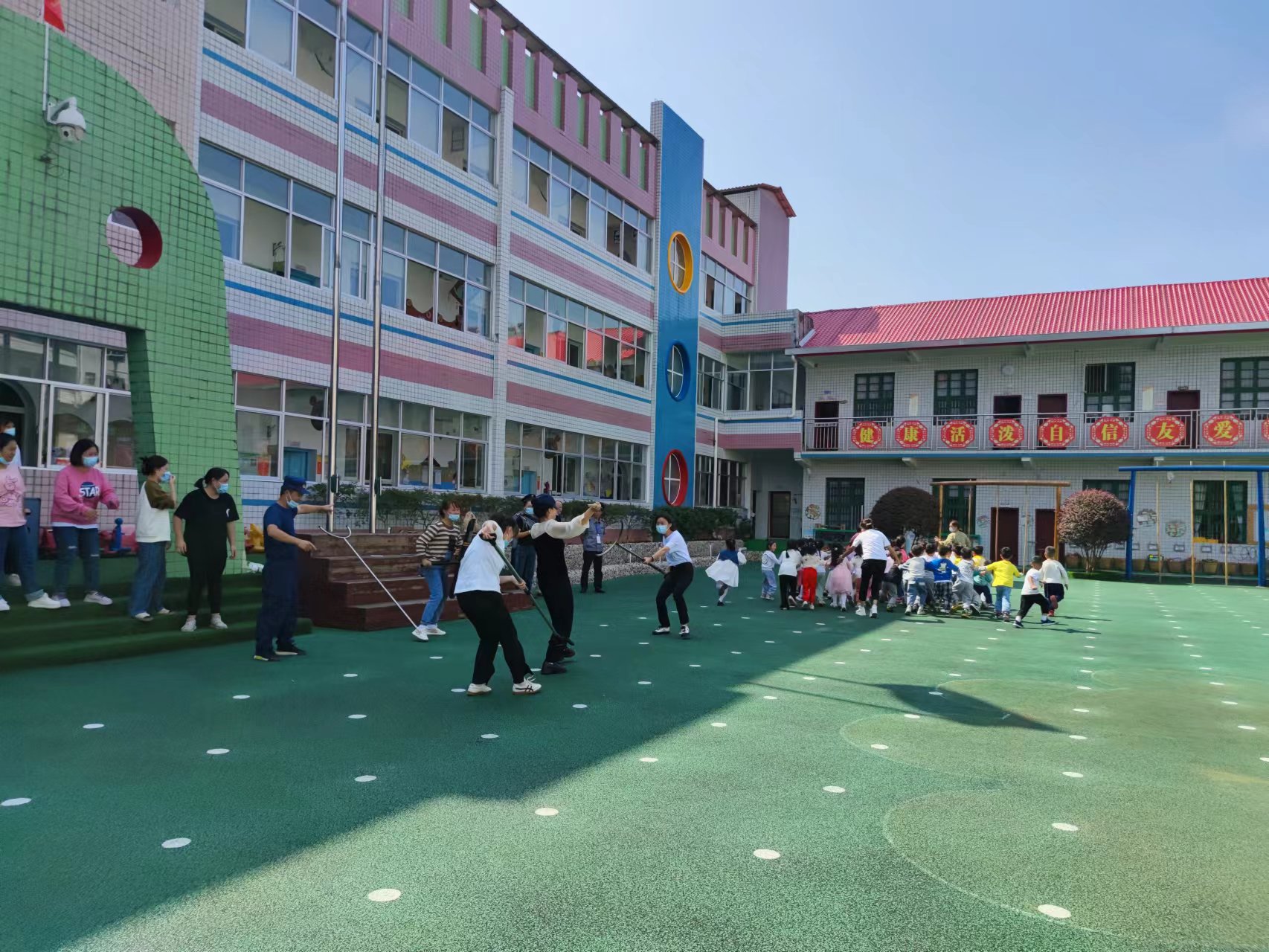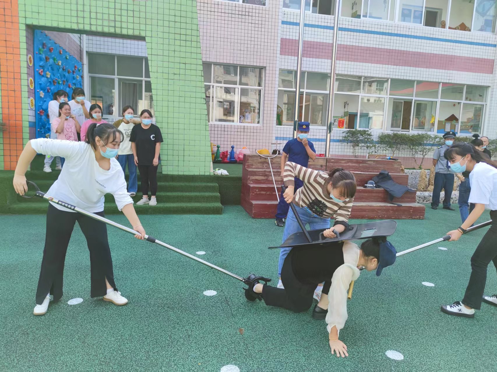 活动时,园长蒋银燕和学校防护小组成员、保安各司其职,使用各种防暴工具抵抗暴力分子行凶,与暴力分子周旋,拖延时间,等待执法人员地救援。各班教师带领幼儿快速有序撤离到安全地段,清点人数,确保每一位幼儿的安全。