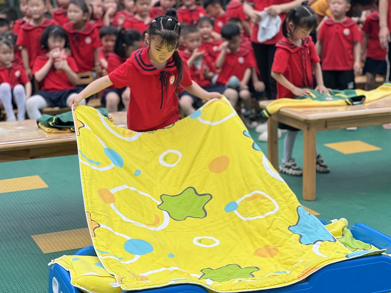 本网讯 6月1日上午冷市镇中心幼儿园开展,欢庆六一活动之“我是生活小能手”自理能力比赛。 比赛项目是各年组老师根据幼儿的年龄特征,以幼儿一日常规为基础而制定。小班组是剥鸡蛋、剥桔子、双脚跳圈;中班组是穿脱衣服、叠被子、单脚跳圈;大班组是整理书包、跳绳。 在比赛过程中孩子们个个摩拳擦掌,信心满满,跃跃欲试,只见小班孩子们手脚麻利的迅速剥鸡蛋;而中班的小朋友也临阵不乱,叠被子的姿势相当娴熟;大班的孩子更是抱着争取第一的心态进行比赛,都以自己最快的速度整理书包。场下的拉拉队,欢呼声一浪高过一浪,一边的老师们也禁不住为本班的小选手们助威呐喊,场面异常热闹。 本次活动圆满结束,孩子们在轻松、愉悦的氛围中,展现了他们的自理能力,不仅增强了自信心,还激发了自我服务的意识,感受到了成长的快乐!(通讯员 吴娉婷)