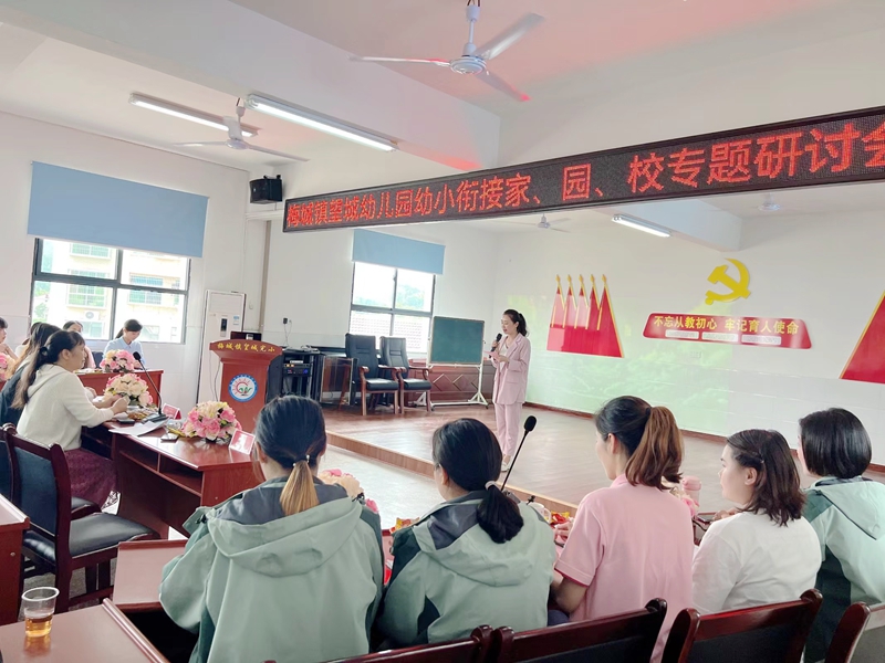 本网讯 5月24日下午13:30分,梅城镇望城幼儿园开展了“与爱同行 科学衔接”家、园、校专题讲座会。本次活动邀请了梅城镇中心学校家长学校校长胡赛华;望城完小教导主任董鸿亮、教师李姣;望城幼儿园家长代表团及教师代表团参加了本次活动,教研主持由该园园长贺霞担任。 活动在轻松愉悦的游戏氛围中拉开序幕,大家分别站在家长教育层面、小学教育层面和幼儿园教育层面,以作画的形式表达了自己的想法,并通过迁移作画启发幼小科学衔接需要三驱联动,共同发力。董鸿亮从孩子身心适应、生活适应、社会适应和学习适应四个方面谈了孩子发展的目标,具体表现和教育建议。贺霞以教研的形式,通过问卷分析、走进孩子、园所准备、科学衔接四个方面与大家交流互动、深入研讨,教师代表团分别从身心准备、生活准备、社会准备和学习准备方面,以视听结合的方式,呈现了幼儿园开展的集体教学活动、游戏活动、主题活动、一日生活活动的内容,让孩子能力得到全面的提升,为入小学做好充分的准备,缓减幼小衔接坡度。 最后胡赛华对本次活动作了既有高度又有深度、既全面又专业的点评和指导,并对家长也提出了殷切希望,陪伴才是最好的教育。幼教道路任重道远,需要我们家、园、校共同携手、科学衔接,为孩子创造最佳的学习与成长环境,本次活动取得圆满成功。(通讯员 贺霞)