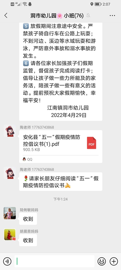 本网讯 4月29日上午洞市幼儿园开展了以“快乐五一,安全第一”为主题的一系列安全教育活动。 注重安全教育,提高孩子的安全防范意识。为此,该园安全专干黄敏辉组织全体老师和幼儿在操场上进行了全园性的安全宣讲活动;要求各班老师将安全教育内容以幼儿年龄特点为依据,以故事情景、PPT图片展示、安全知识竞赛等游戏化的方式再次将安全内容进行传授和宣讲:如“预防疫情、防溺水、交通安全、饮食安全、防火、防水、防陌生人、预防性侵”等等,通过具体事例帮助孩子们梳理、积累安全生活的经验,提高孩子们假期安全意识与能力。 携手家长力量,形成安全教育合力。幼儿园单方面的教育是远远不够的,因此,该园采取派发“放假通知”“温馨提示”及《幼儿假期安全倡议书》广泛向家长宣传假期切实履行监管孩子的职责,确保孩子五一假期里的安全。 一系列的假期安全教育活动的开展,增强了孩子们的安全意识,为孩子们在五一在假期中撑起了一把平安伞,确保了全体师幼及家长度过一个快乐、祥和、安全的假期。(通讯员 罗章玲)
