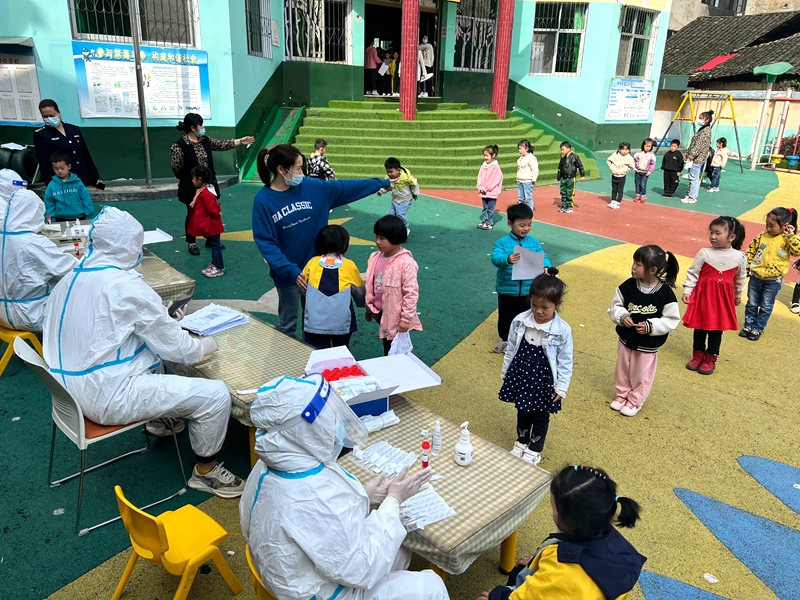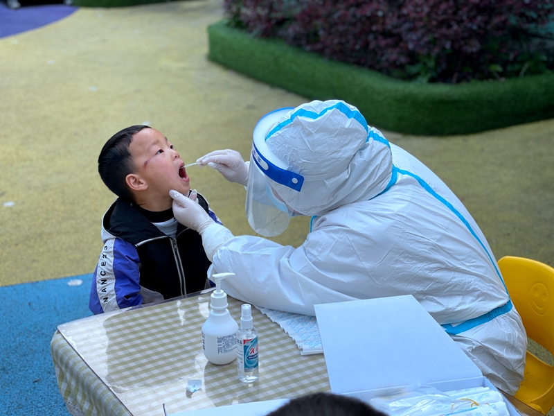 核酸检测分时段、分批次进行。孩子们在班级老师的带领下,保持一米距离自觉排队,每人手持健康码整齐有序地在园内排队等待核酸检测。医务人员身穿防护服,以咽拭子方式采集标本,整个检测过程规范、安全、有序;在检测中,教师分工明确,全园幼儿积极配合,不到1小时,全部师幼核酸检测采集完成。(通讯员 陶柳玉)