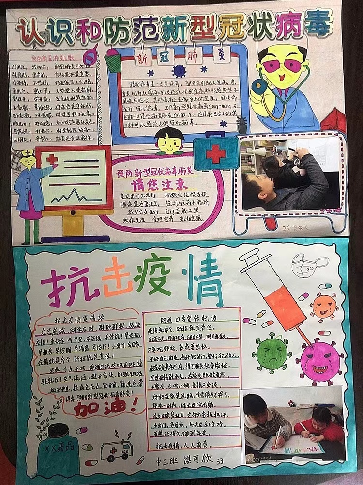 活动中每个家庭踊跃参与,纷纷行动起来,精心绘制了精美的手抄报。“万众一心”“中国加油”……一句句朴实的言语,折射出孩子们最单纯的愿望,最热烈的爱国情感,他们用自己的画笔,把防疫知识印在纸上。