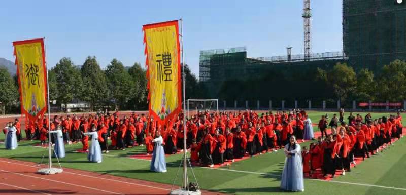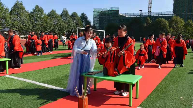 本网讯 11月30日大福镇中心幼儿园举行了“研习六艺,传承国学”大型国学亲子活动。该园全体教职员工、幼儿及家长共600余人参加了此次活动 当时上午8时,孩子们在幼儿园的精心组织及家长的陪伴下,身着传统汉服,来到安化县第四高级中学的活动现场。 8时30分活动开始,全体幼儿及家长相互整理着装,进行准备活动——行盥洗礼。希望在今后的学习中心无旁骛,用勤劳的双手开启知识的大门。在老师的引领下,孩子们学习了中国传统的揖礼,并且向孔子像行深揖三拜礼。让孩子学习中国优秀传统文化,并深受其熏陶,成为一个有文化底蕴的人。紧接着各位老师为孩子们亲点朱砂,愿孩子们从此眼明心明,好读书,读好书。开笔仪式环节,孩子们第一次使用毛笔写出了简单而意义深远的“人”字,寓意着在人生的启蒙阶段,学会做人是最为重要的。随后,孩子们和老师一起诵读《弟子规》,感受国学文化。老师们用古典舞《怎叹》给孩子们展现“乐”及汉服的魅力。通过骑木马亲子游戏,让孩子们感受“御”。