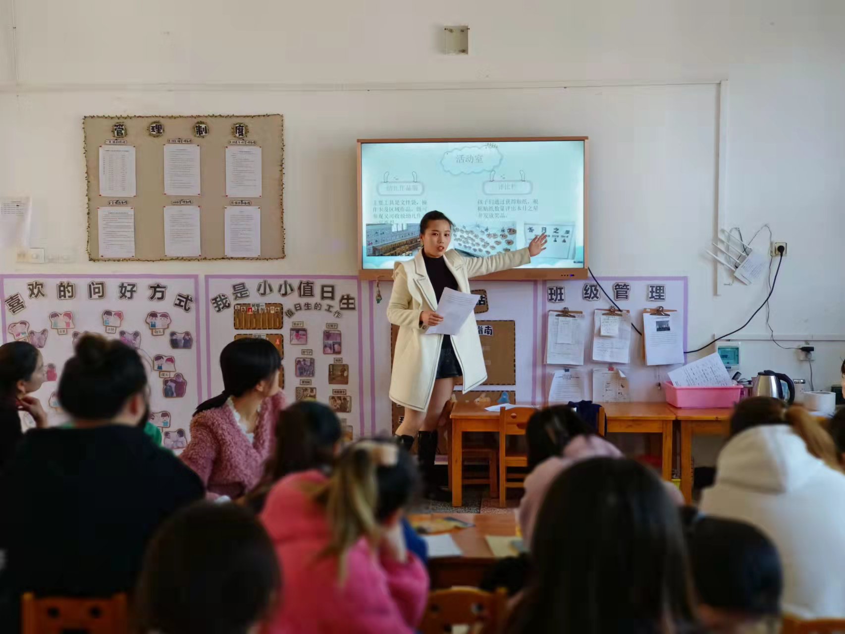 本网讯 11月25日中午,长塘镇中心幼儿园开展了班级环创分享交流会,旨在促进全园教师取长补短,共同成长。 本次环创分享的班级分别是大三班和中四班。大三班教师马娟从环境创设、区角活动、以及幼儿游戏的情况展开了详细的阐述,强调了环境创设和区域活动的价值,通过适宜的材料操作,让孩子自主操作,体验游戏带来的快乐。中四班教师谭盼从主题墙、活动室、区域活动为切入点,通过师幼讨论,共同制作,以原木色系为主,秉持环境创设的五项原则,坚持开展健康,绿色的区域活动,让幼儿在活动中成长,增强幼儿的自理能力。(通讯员 伍叶群) |