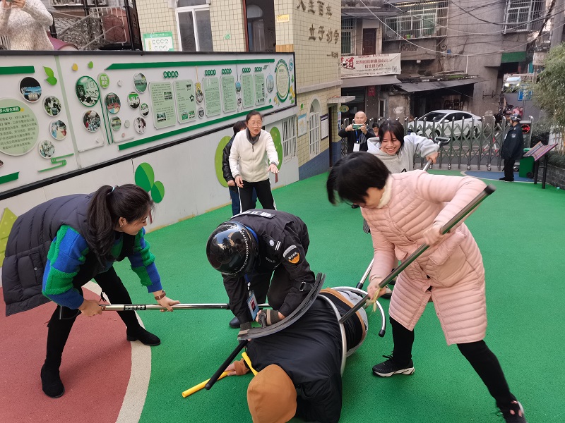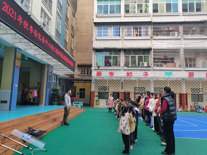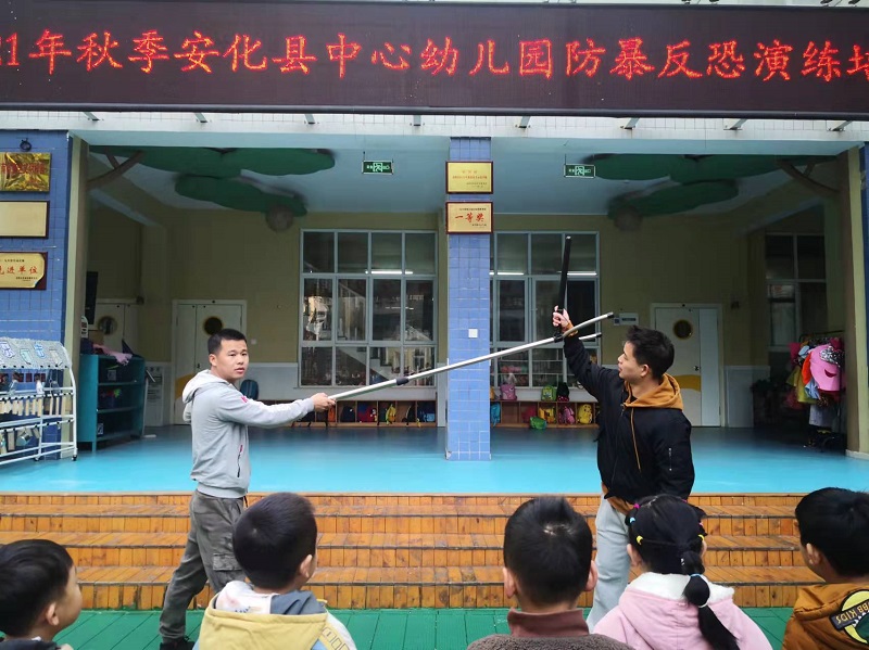 本网讯 11月24日上午8:30,安化县中心幼儿园在操场开启了一场以反恐防暴为主题的安全培训活动。全体师幼、保安人员在田教官简要易懂的解说与示范下,逐一认识各类防暴反恐武器,如脚叉、腰叉、防护盾牌、警棒、防刺服等,并了解不同状况下操作的方法和要点;在该园入口处,大家共同参与、观摩多轮预设歹徒突袭幼儿园的应对演练活动。“歹徒”、保安、现场制暴者、观摩师幼等在田教官手把手地传授下,直观又深刻地领悟到在实际工作和生活中反恐防暴的真正目的和正确做法,大家在场纷纷表示此次培训和演练受益大,实操性强。 据悉,此次活动由安化县锦卫保安服务有限公司和安化县中心幼儿园联合举办,特邀请反恐防暴知识性强、实战经验丰富的专家现场培训与指导,旨在有效防范该园暴力事件发生,维护该园平安稳定,进一步增强全体教职工对突发事件的应变能力及保护幼儿有效逃生避险的安保能力,营造和谐有序的育人环境。