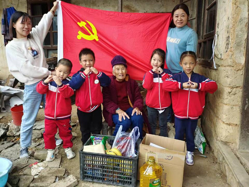 本网讯 党旗引领,爱在传承。10月14日是传统的重阳节,上午9点乐安镇中心幼儿园党员教师带领幼儿代表来到乐安镇乐桥社区洞井冲的孤寡老人李华志的家里,送上孩子们最真诚的节日祝福与特殊的爱心小礼品。在老人家里,党员教师与孩子们一起帮老人整理屋子、打扫卫生,献上他们自编自导的舞蹈,这个一声“爷爷好”,那个一句“爷爷,我爱你”,整个屋子欢声笑语、热闹非凡。让老人乐开了花,眼里噙满热泪,连声说:共产党好!老师好!孩子们好!之后,又去慰问了同村的两个年过八旬的留守老人,送去欢乐,送去祝福。 据悉,这项活动,该园已经连续坚持了整整八年,传递党的温暖,让爱流淌,将尊老、敬老、爱老的传统美德深深的植根到每一个孩子灵魂之中。