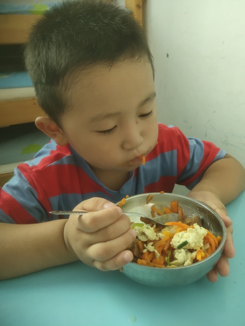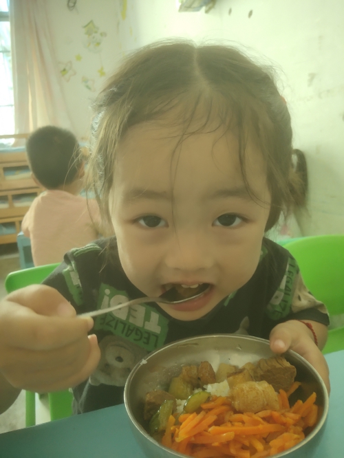 本网讯 9月26日中午,江南镇中心幼儿园一幅幅温馨的画面让人感动不已:宽敞明亮的教室、干净整洁的餐桌、笑容满面的孩子,桌上摆着红烧肉炖黄瓜、小炒红萝卜丝、排骨淮山汤、炒鸡蛋等香喷喷的菜肴,令人馋涎欲滴。孩子们大口大口地吃着,脸上满满的都是幸福感。