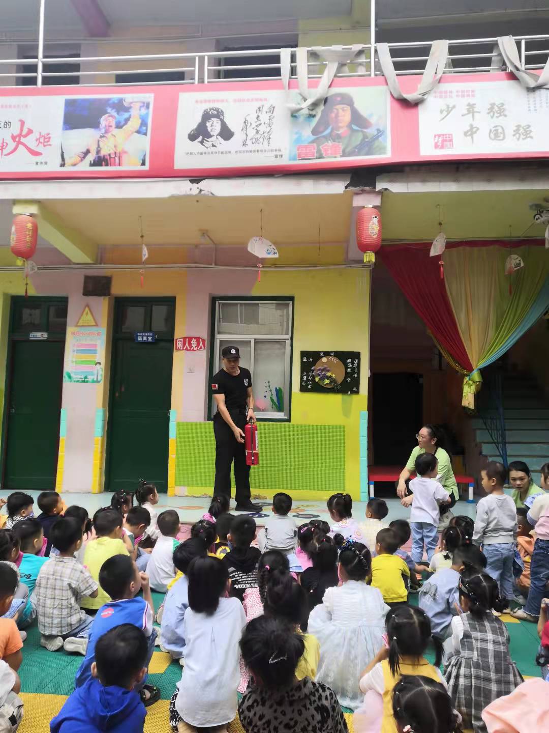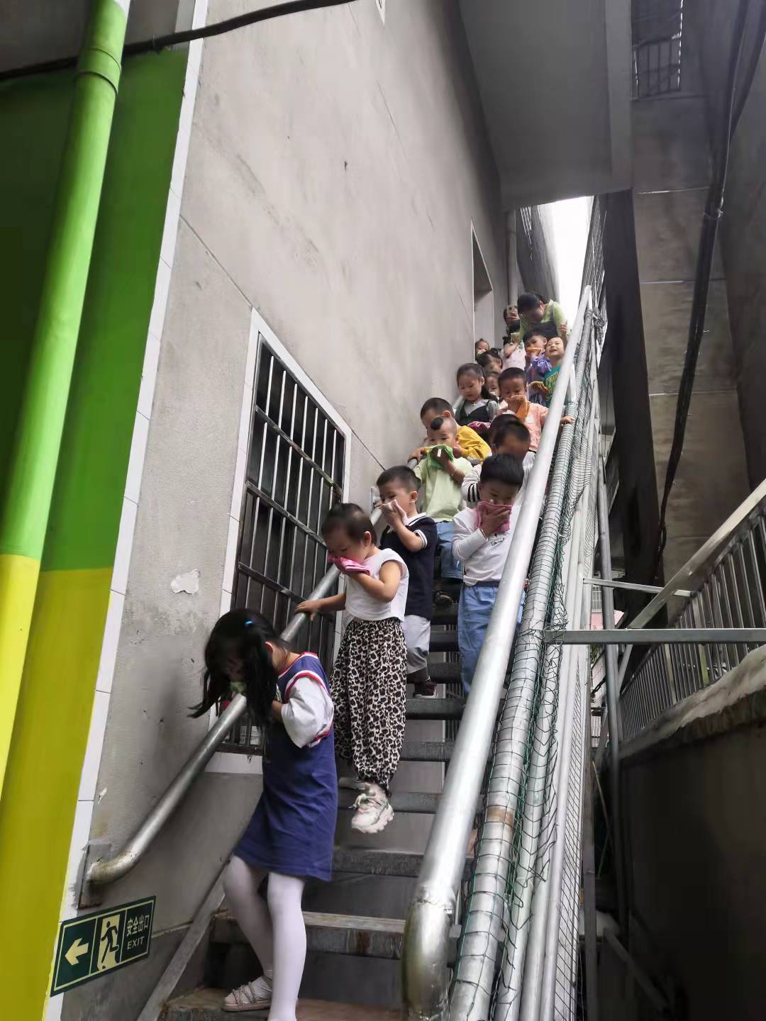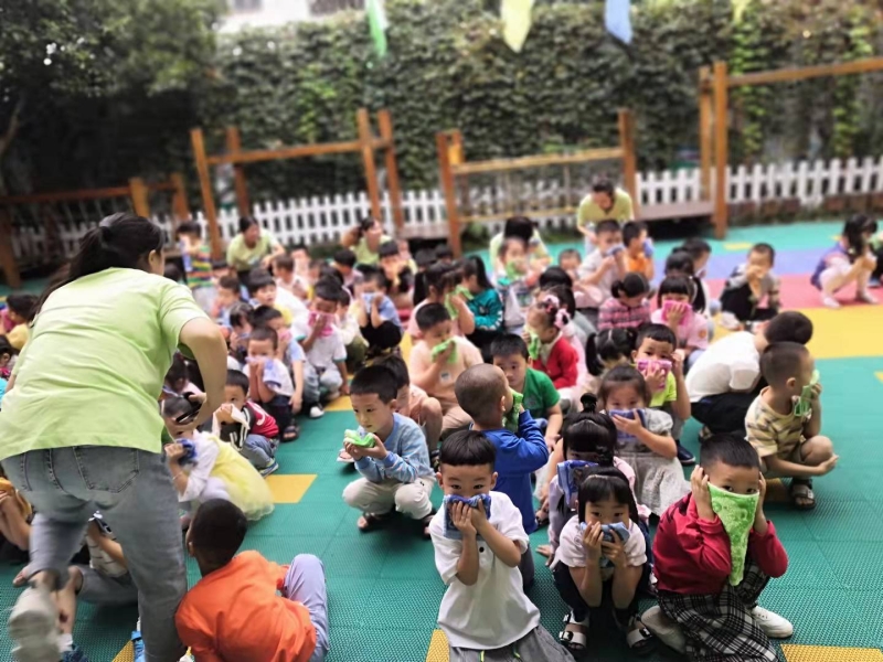 9:00刺耳的报警声响彻整个校园,孩子们在各班老师的带领下用湿毛巾捂住口鼻,躬身沿着楼道从楼梯走下来。有序撤离到操场。到达安全场地老师们迅速清点各班人数。整个消防疏散演练用时4分20秒。疏散结束后,后勤主任喻敏波为小朋友们详细讲解了消防安全知识、示范了灭火器的使用。