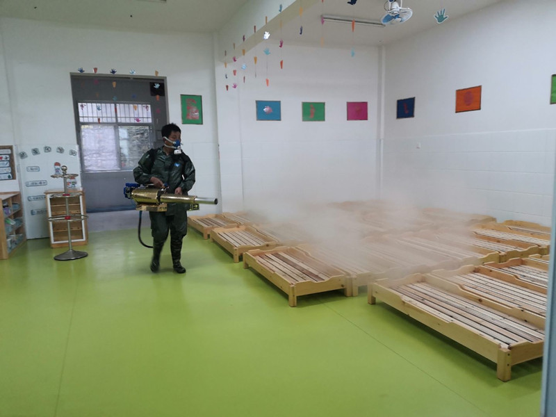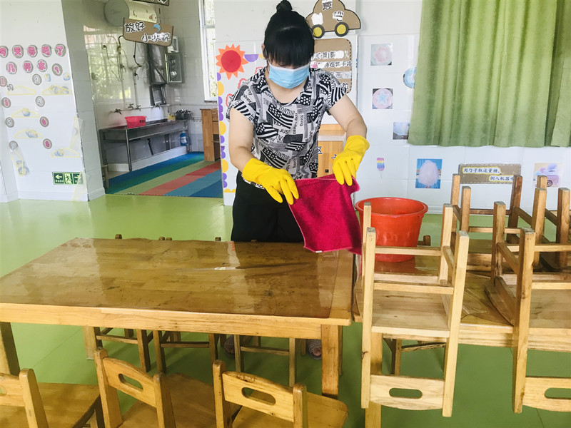 总务主任卢顺能组织全体后勤人员对幼儿园活动室、走廊、盥洗室、厨房、办公室、大型玩具等进行了全面彻底的清洁和消毒。保育主任杨婷带领保育员老师用配比好的消毒水擦拭柜子、桌椅、扶把手等,并对幼儿被褥、图书、玩具进行清洗暴晒。