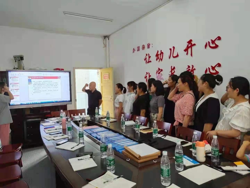 这次培训会,园领导高度重视,精心组织,认真安排,全员参与。培训会于早上九点在会议室准时召开,培训共三个内容。首先,业务园长组织学习了幼儿教师师德修养与职业规划。全休教师进行了宣誓。园长组织学习了党史---习近平总书记在全国教育大会上发表的重要讲话。为做好新时代教育工作提供了根本遵循和行动指南。最后,学习了安吉游戏及安吉游戏在该园的开展与实施探讨。