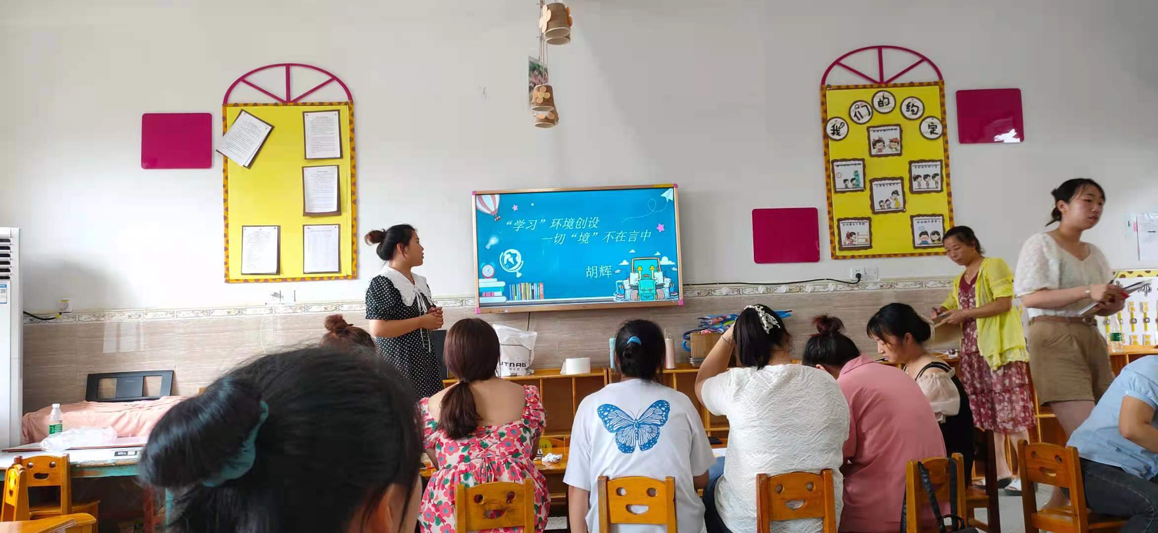 本网讯 8月24日,长塘镇中心幼儿园组织全体教师开展了以《“学习“”环境创设,一切“境”在不言中》为主题的环境创设培训活动。 此次培训活动内容丰富多彩、观点鲜明,通过对环境创设的主要内容、注意事项等多个方面进行详细阐述。通过系统的学习,教师们获得了环境创设设计理念的整体提升。理论“行”于实践,培训学习后,全体教师分楼层展开相关研讨,并结合本班实际情况,对楼层环创提出可行的创意和想法,并深挖主题内容,研究板式设计和色彩搭配,在细节中体现生活中的教育。