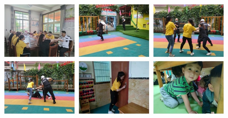 下午,孩子们在操场上玩得正开心,突然,校园警报声骤然响起,一名恐怖分子持械闯入幼儿园,情况紧急,老师们立即组织幼儿有序逃离操场,进行躲避;教室里,听到警报的师生们迅速做出反应,老师们第一时间锁上教师大门,保护小朋友们躲到安全的地方,更有几位老师临危不惧,拿上长棍,盾牌等工具,协助保安一起与歹徒周旋、搏斗,大家齐心协力,共同制服了歹徒。