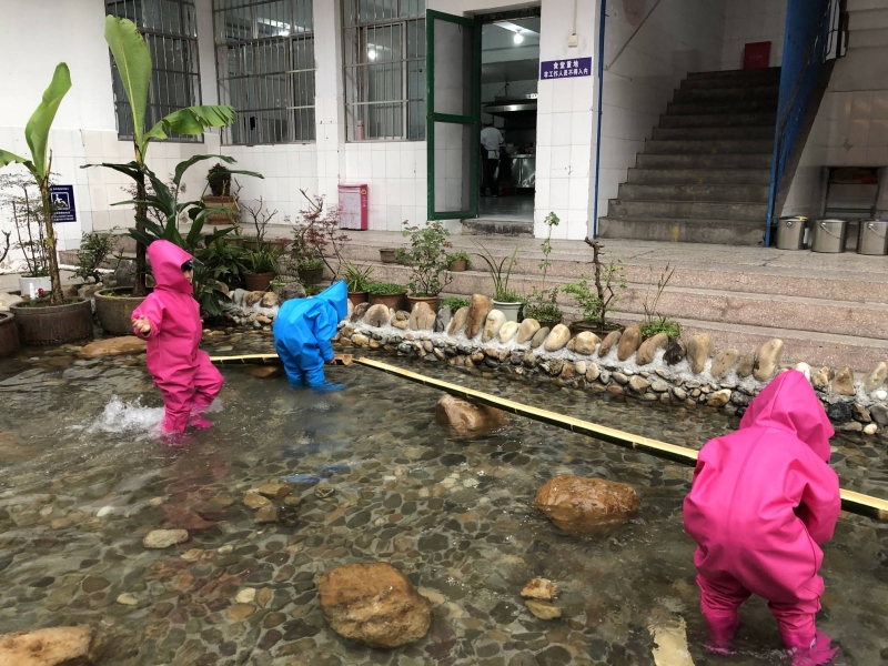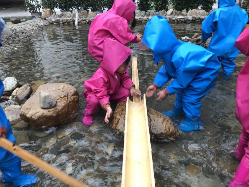 孩子们穿好雨衣,小心翼翼地走进“水世界”,一会儿坐在石头上用脚踢水,一会儿三五成群的打着水仗,开心的不得了!游戏的重头戏来了,他们拿着竹子,分工合作搭建了一个水渠。