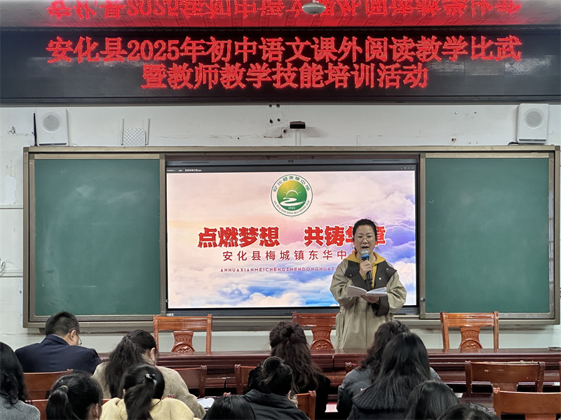 本网讯 12月3日,安化县2025年初中语文课外阅读教学比武暨教师教学技能培训分区复赛在梅城镇东华中学圆满收官,为来自大福、清塘、乐安、梅城等七个乡镇的参赛团队搭建了一个高效交流、充分展示教学风采的专业平台。 县教师发展中心语文教研员陈艳辉在东华中学会议室主持开幕式,她详细阐释了本次竞赛的规则以及教师教学技能培训的具体要求,东华中学党支部书记、校长李兴家校长介绍了该校“以人为本,追求卓越”的办学理念,还分享了在语文教学方面的特色与成果,县教师发展中心副主任陈高峰着重强调了活动纪律,并深入阐述了课外阅读在培育学生核心素养方面的重要意义,为活动的开展奠定了坚实的思想基础。 比武精彩纷呈各有特色。七个参赛团队,每个团队共三人依次登台授课、课堂点评、介绍学校课外阅读开展情况。特别是授课环节,选手们都围绕课外阅读教学这一主题,精心设计教学流程,各展教学风采。有的教师以经典文本为切入点,巧妙引导学生梳理阅读思路,让学生在经典中汲取智慧;有的教师采用小组合作模式,鼓励学生积极分享阅读感悟,激发了学生的思维火花;还有的教师结合多媒体资源,通过生动形象的图片、视频等,拓展了阅读的深度与广度,让课堂变得更加丰富多彩。课堂上,师生互动频繁,学生们主动思考、积极发言,充分展现了优质课外阅读教学的生动样态。 经过一天的激烈角逐,最后陈艳辉对每个参赛团队进行了精准点评,她既充分肯定了每个团队的亮点和特色,也客观地指出了存在的问题和可优化的方向,并提供了宝贵的改进建议。安化八中与东华中学凭借出色的表现荣获一等奖,长塘中学与乐安中学荣获二等奖,木孔中学、清塘中学、坪口中学分别获得三等奖。他们纷纷表示将把在活动中的所学所悟运用到实际教学中,持续优化课外阅读教学策略,为学生提供更优质的语文教育。 初审初校:曹靖阳 复审复校:眭向葵 终审终校:李兴家