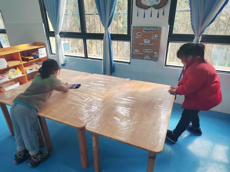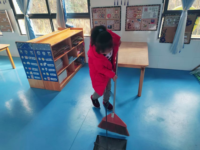 活动中,孩子们分工协作,有的拿着抹布认真擦拭餐桌,从桌面到桌沿,不放过任何一个角落;有的手握扫帚和簸箕,仔细清扫地面的饭粒与碎屑。虽然动作稍显稚嫩,但每一个孩子都投入十足,专注的模样尽显认真。擦桌子时,他们学着老师的样子将抹布叠整齐,反复擦拭直到桌面光亮;扫地时,小心翼翼地把垃圾归拢到簸箕中,完成后还会互相检查打扫成果。