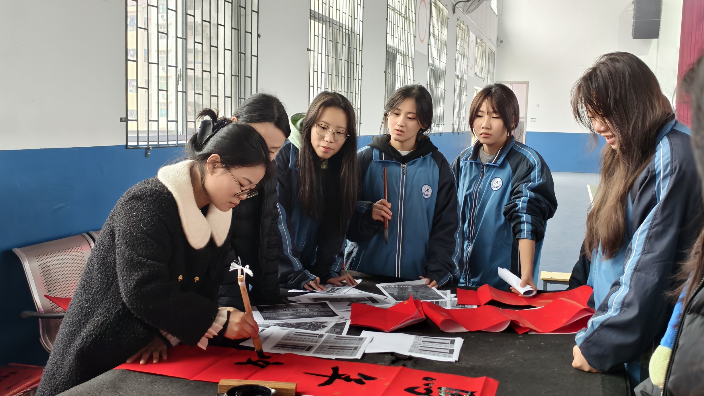 本网讯 12月29日,安化县第十二高级中学举行了“翰墨传情迎新春,笔尖祝福满校园”迎新年写对联活动,吸引了众多师生参与,校园内墨香四溢,年味浓浓。 活动现场,红纸铺展,笔墨齐备。该校擅长书法的教师与书法专业的学生们齐聚一堂,挥毫泼墨,笔走龙蛇。一副副寓意吉祥、满载美好祝愿的春联和“福”字在他们笔下诞生,寄托着对新年美好的期盼。师生们踊跃参与,或驻足欣赏,或精心挑选对联内容,在墨香中感受浓浓的年味和传统文化魅力。 此次活动据悉是该校申报国家级美育特色学校背景下举办的,这份特别的“新年礼物”也让师生们在生活中遇见了传统文化的美。 初审初校:林夏 复审复校:贺志平 黄灿宜 终审终校:龚加宜