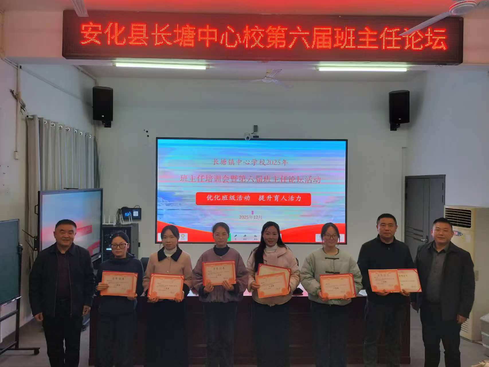 本网讯 12月24日,长塘镇中心学校成功举办班主任培训会暨第六届班主任论坛活动。来自全镇4所学校的校长、副校长、教务主任、政教主任、德育主任及59名班主任齐聚一堂,共同参与此次培训。安化县教育局学校安全管理股股长李佳保、副股长方怡富应邀出席。培训会由该镇中心学校副校长兼教务处主任谭清以主持。 在经验分享环节,姚思思、姚扬、王艳、陈群、周璇、黄爽六位班主任依次登台,倾情分享各自在班级管理中的特色“秘籍”。他们的实践虽侧重不同,却集中体现了情感育人、学生自主、激励赋能、家校协同等共同理念。生动真实的案例,为现场教师提供了可借鉴、可迁移的带班策略与管理智慧。 随后,方怡富作题为《用心用情,守护孩子生命安全》的专题讲座。他结合现实案例,系统阐述了校园安全工作的关键环节,强调要在宣传教育上做实、在管理机制上优化、在应急处置上科学,为全体参培人员上了一堂深刻而实用的安全必修课。 论坛对分享成果突出的班主任进行了表彰。姚思思等6人获一等奖,杨向红等10人获二等奖,陈祉骆等10人获三等奖。该镇中心学校领导现场为获奖教师颁发了荣誉证书。 该镇中心学校校长廖志中在总结中表示,班主任是立德树人的关键力量。本次论坛既是一次经验的交汇,也是一次责任的夯实。希望全镇班主任以此次活动为起点,将所学所感转化为日常教育的温度与实效,共同书写长塘教育高质量发展的新篇章。 本次论坛以“优化班级活动,提升育人活力”为主线,不仅搭建了班主任专业发展的交流平台,更进一步强化了全体教师的育人使命感与校园安全责任感,为持续推进全镇教育优质发展注入了新的动力。 初审初校:王辉忠 复审复校:谭清以 终审终校:廖志中