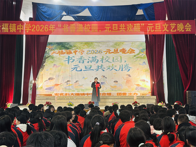 本网讯 12月30日,大福镇中学风雨球场内欢声笑语、掌声如潮,2026年“书香满校园,元旦共欢腾”元旦文艺汇演在此隆重举行。全校师生齐聚一堂,共同迎接新年的到来。