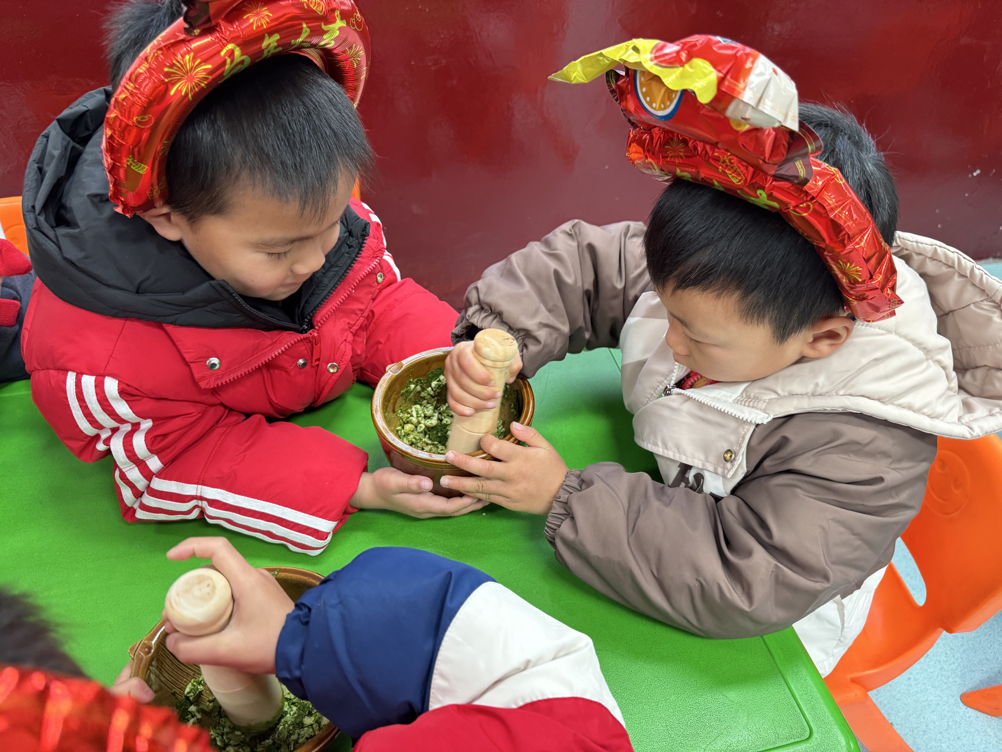 本网讯 元旦前夕,仙溪镇山口幼儿园户外活动场飘起阵阵擂茶香。全体师幼围聚于此,以“童趣擂茶香 萌娃庆新年”为主题,在亲手制作擂茶的过程中,感受安化本土民俗的烟火气,迎接新年到来。 上午九点活动拉开序幕。教师简单讲解安全规则后,孩子们分成三组,有条不紊地投入食材初加工。茶叶处理组的萌娃们戴着手套,认真将老茶叶与茶梗分离,把纯净的茶叶整齐放进托盘,指尖沾着翠绿;玉米剥剥乐小组的孩子们围坐一桌,指尖翻飞专注剥壳,金黄的玉米粒簌簌落入盘中,堆起小小的“金山”;花生擂擂队的小家伙们握紧擂棒,在教师看护下,对着擂钵里的花生慢慢研磨,擂棒转动间,花生逐渐变成细碎粉末。 十点,擂茶制作进入关键环节。教师站在台前演示:先将茶叶、生姜、白芝麻放入擂钵,双手握住擂棒反复擂动,直至食材变得细腻;再加入花生碎、玉米粒,继续擂拌均匀;最后冲入温水,撒上少许盐调味,一碗鲜香的擂茶便成型。孩子们按顺序上台体验,小拳头握紧擂棒,跟着教师的节奏前后晃动,虽动作略显笨拙,却格外认真。旁边的小伙伴们齐声喊着“加油”,擂钵碰撞声、欢呼声交织在一起。 茶话时光,孩子们端着自己参与制作的擂茶,小口品尝。茶汤清香萦绕,搭配着桌上的饼干、水果,孩子们边吃边聊,你分给我一块零食,我和你分享擂茶的味道,还不忘对着同伴轻声说一句“元旦快乐”,脸上满是满足。 初审初校:龙俏朵 复审复校:姚喜凤 终审终校:姚加保