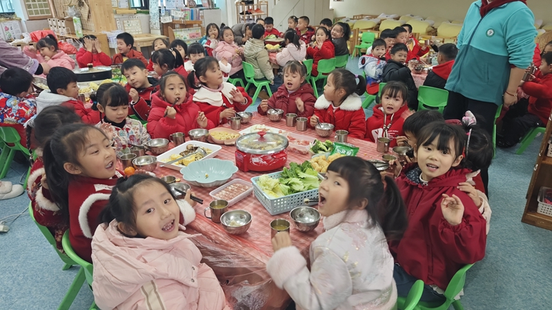 本网讯 近日,东坪镇中心幼儿园萸江园以“五福迎新年 童心润民俗”为主题,开展元旦庆祝活动,让孩子们在民俗体验中欢喜迎新。 清晨,家长志愿者齐聚园门口,挥毫写福字、撰春联,将满满的新年祝福送给入园的孩子们。各班级活动精彩纷呈:剪纸、贴画、拓印等传统手工趣味十足;套圈、投壶、吸福等民俗游戏热闹非凡;孩子们还亲手制作糖葫芦、汤圆、甜枣,尽享舌尖甜蜜。大班专场自理能力比赛中,孩子们比拼叠衣服、擦桌子、夹豆子,尽显成长风采。 活动尾声,全园共享暖心火锅宴,欢声笑语里,大家共度温馨时光。将传统民俗与童趣玩乐巧妙融合,不仅让孩子们在亲身体验中领略了中华传统文化的魅力,更在欢声笑语中收获了满满的幸福与成长。 初审初校:李锦超 复审复校:温洁 终审终校:颜群芳