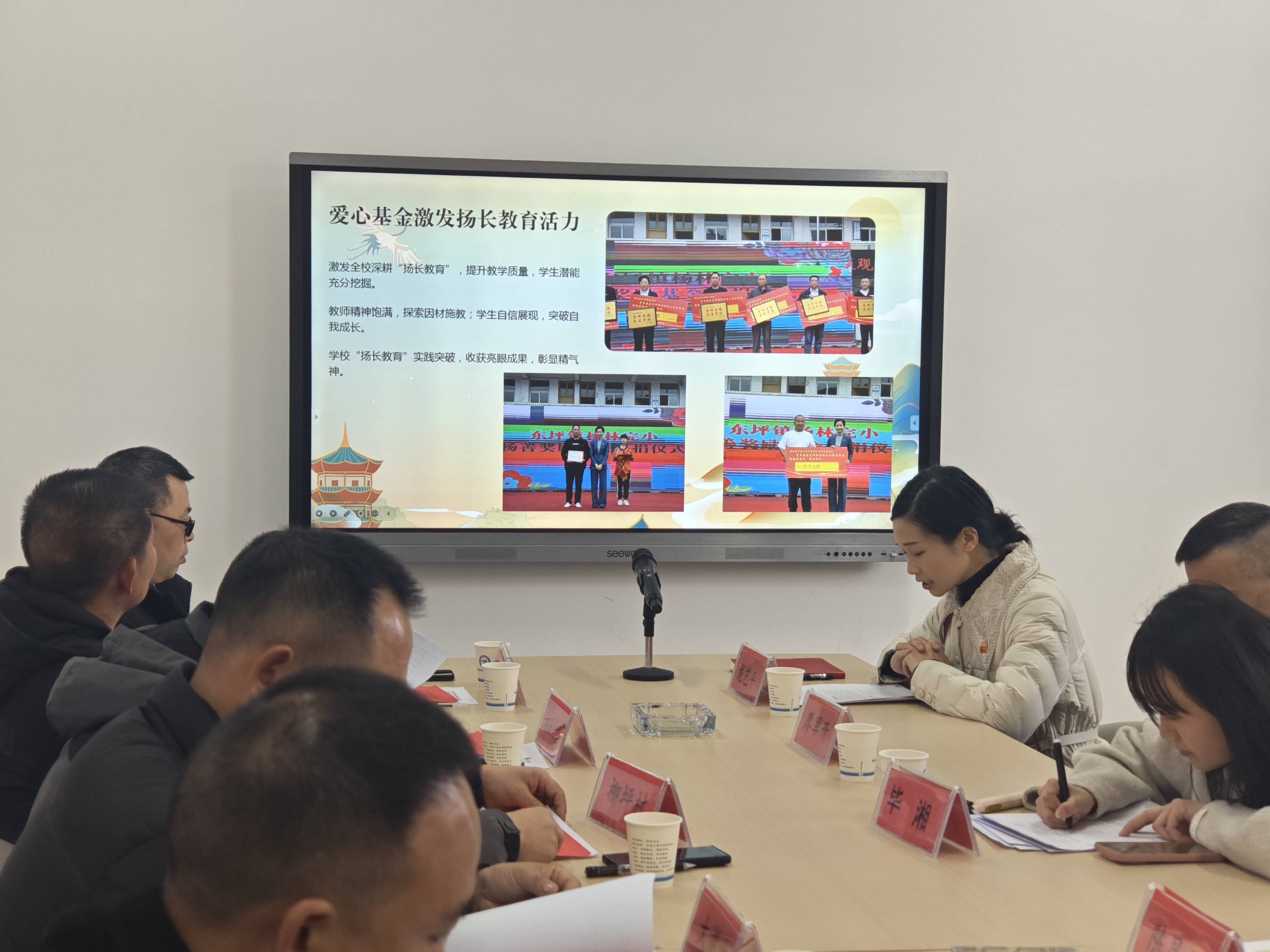 活动伊始,与会代表参观了校园风雨长廊,听取学生解说员对“扬长文化”及办学成果的介绍。随后会议正式召开,龙艺平校长致辞回顾基金设立初衷,感谢各界支持,并汇报基金使用成效。会上,校长解读了《2025年杨善奖励基金分配方案(审议稿)》,经代表讨论后一致表决通过。