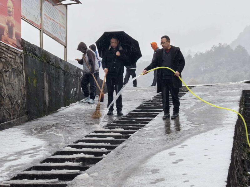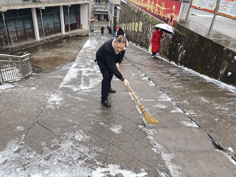 本网讯 1月20日,东坪镇杨林社区迎来降雪降温天气,校园道路积雪结冰严重。当日上午,学校党支部书记、校长李欧带头,组织党员干部及教职工冒着风雪开展义务扫雪。 他们手持扫帚、水管等工具,重点对校门口、主干道、台阶等区域的积雪和暗冰进行清理。尽管天气寒冷,大家干劲十足,经过数小时的奋战,校园内外主要通行路段的冰雪被有效清除,一条条干净、安全的路道得以恢复,极大降低了师生滑倒摔伤的风险,确保了校园道路的畅通。 过往师生及附近居民对此纷纷点赞,称这场及时的扫雪行动不仅扫除了出行障碍,更“扫”出了温情与凝聚力,展现了杨林中学教职工队伍以生为本、乐于奉献的良好精神风貌。李欧表示,学校党员干部要有责任有担当,以实际行动为师生营造安全的校园环境。 初审初校:罗 毅 复审复校:王择政 终审终校:李 欧