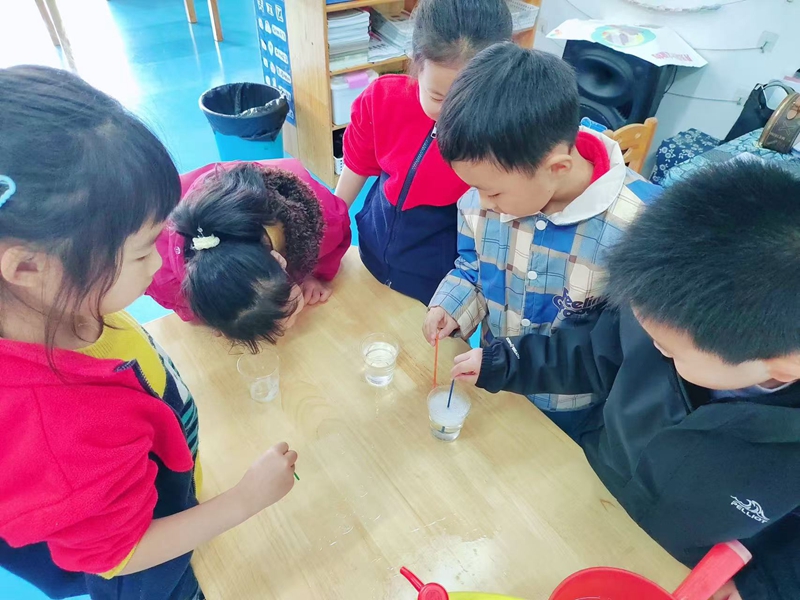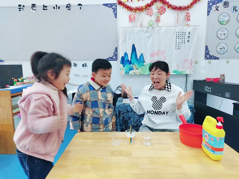 孩子们兴奋地欢呼起来,纷纷分享自己的发现。有的幼儿说:“洗洁精让水变得不一样了,小棒就站稳了!”还有的幼儿认真观察着水中的小棒,不断调整小棒的位置,探索让小棒站得更稳的秘诀。整个活动过程中,孩子们专注投入,积极动手、大胆表达,在一次次尝试与体验中感受科学的奥秘。