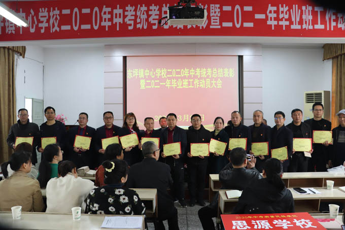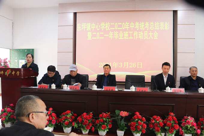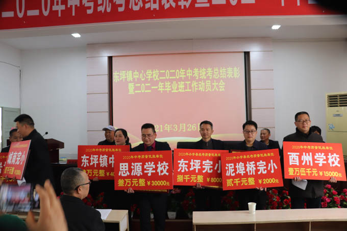 大会由王爱国主持。他指出了开会的目的,宣布了大会议程。大会第一项由东坪镇中学副校长卢晓晖致欢迎词。大会第二项由喻江涛宣读《东坪镇人民政府表彰决定》并颁奖。酉州学校,思源学校,东坪镇中学,东坪完小,泥埠桥完小,城南完小荣获“质量优胜单位”称号,杨林中学获质量进步奖;王辉等20多人荣获管理奖;何芹姣等30余人荣获“中考优秀班主任”,还有优秀学科等。大会第三项由来自东坪完小的罗建刚、思源学校的刘巩元、东坪镇中学的熊健、杨林中学的戴丽娟相继从不同方面做了中考经验分享。大会第四项 ,彭学时作题为《高举质量旗帜,强化备考措施,为夺取2021年中考统考全面胜利而努力奋斗》的毕业班动员报告。报告对全镇2020年中考统考进行了详细的质量分析;对2021年中考统考提出了具体要求及备考措施。他强调 将举全镇之力消除薄弱学校,花大气力消除薄弱学科。他表示 只要高举质量旗帜不动摇,强化备考措施不走样,夺取2021年中考统考全面胜利指日可待。大会第五项,木子中学校长谌中华作了表态发言。最后,卢映云作重要讲话,他向战斗在第一线的全体教职员工表示慰问,向获得奖励的单位和个人表示祝贺。并代表政府表态,将坚持教育优先的理念,一如既往支持教育的发展,为教育排忧解难。