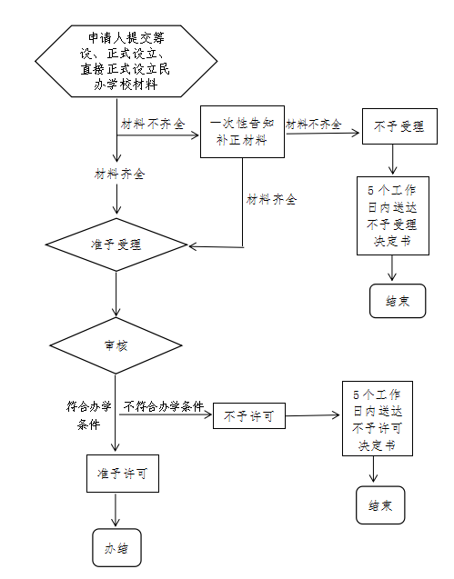 一、涉及事项 1.营利性民办学校的筹设审批 2.营利性民办学校的设立审批 3.非营利性民办学校的筹设审批 4.非营利性民办学校的设立审批 二、办理依据 1.《中华人民共和国民办教育促进法》 第二章设立第十条 举办民办学校的社会组织,应当具有法人资格。 举办民办学校的个人,应当具有政治权利和完全民事行为能力。 民办学校应当具备法人条件。 第十一条 设立民办学校应当符合当地教育发展的需求,具备教育法和其他有关法律、法规规定的条件。 民办学校的设置标准参照同级同类公办学校的设置标准执行。 第十二条 举办实施学历教育、学前教育、自学考试助学及其他文化教育的民办学校,由县级以上人民政府教育行政部门按照国家规定的权限审批;举办实施以职业技能为主的职业资格培训、职业技能培训的民办学校,由县级以上人民政府人力资源社会保障行政部门按照国家规定的权限审批,并抄送同级教育行政部门备案。 第十三条 申请筹设民办学校,举办者应当向审批机关提交下列材料: (一)申办报告,内容应当主要包括:举办者、培养目标、办学规模、办学层次、办学形式、办学条件、内部管理体制、经费筹措与管理使用等; (二)举办者的姓名、住址或者名称、地址; (三)资产来源、资金数额及有效证明文件,并载明产权; (四)属捐赠性质的校产须提交捐赠协议,载明捐赠人的姓名、所捐资产的数额、用途和管理方法及相关有效证明文件。 第十四条 审批机关应当自受理筹设民办学校的申请之日起三十日内以书面形式作出是否同意的决定。 同意筹设的,发给筹设批准书。不同意筹设的,应当说明理由。 筹设期不得超过三年。超过三年的,举办者应当重新申报。 第十五条 申请正式设立民办学校的,举办者应当向审批机关提交下列材料: (一)筹设批准书; (二)筹设情况报告; (三)学校章程、首届学校理事会、董事会或者其他决策机构组成人员名单; (四)学校资产的有效证明文件; (五)校长、教师、财会人员的资格证明文件。 第十六条 具备办学条件,达到设置标准的,可以直接申请正式设立,并应当提交本法第十三条和第十五条(三)、(四)、(五)项规定的材料。 第十七条 申请正式设立民办学校的,审批机关应当自受理之日起三个月内以书面形式作出是否批准的决定,并送达申请人;其中申请正式设立民办高等学校的,审批机关也可以自受理之日起六个月内以书面形式作出是否批准的决定,并送达申请人。 第十八条 审批机关对批准正式设立的民办学校发给办学许可证。 审批机关对不批准正式设立的,应当说明理由。 第十九条 民办学校的举办者可以自主选择设立非营利性或者营利性民办学校。但是,不得设立实施义务教育的营利性民办学校。 非营利性民办学校的举办者不得取得办学收益,学校的办学结余全部用于办学。 营利性民办学校的举办者可以取得办学收益,学校的办学结余依照公司法等有关法律、行政法规的规定处理。 民办学校取得办学许可证后,进行法人登记,登记机关应当依法予以办理。 2.《中华人民共和国民办教育促进法实施条例》(国务院令第399号) 第三章民办学校的设立 第十三条 申请正式设立实施学历教育的民办学校的,审批机关受理申请后,应当组织专家委员会评议,由专家委员会提出咨询意见。 (一)学校的名称、地址; (一)登记申请书; (二)办学许可证; 登记机关应当自收到前款规定的申请材料之日起5个工作日内完成登记程序。 3.湖南省实施《中华人民共和国民办教育促进法》办法 第十条 设立民办学校,应当符合法定条件,并按照下列规定报批: (四)高级中等学历教育学校,由设区的市、自治州人民政府教育行政部门审批;中级职业技能培训的民办职业培训机构,由设区的市、自治州人民政府劳动和社会保障行政部门审批; (五)初级中等以下学历教育学校、幼儿教育机构,由县级人民政府教育行政部门审批;初级职业技能和非技术岗位的民办职业培训机构,由县级人民政府劳动和社会保障行政部门审批。 4.教育部、人力资源社会保障部、工商总局关于印发《营利性民办学校监督管理实施细则》的通知 第二章学校设立 第五条 批准设立营利性民办学校参照国家同级同类学校设置标准,一般分筹设、正式设立两个阶段。经批准筹设的营利性民办学校,举办者应当自批准筹设之日起3年内提出正式设立申请,3年内未提出正式设立申请的,原筹设批复文件自然废止。 营利性民办学校在筹设期内不得招生。 第六条 审批机关应当坚持高水平、有特色导向批准设立营利性民办学校。设立营利性民办高等学校,应当纳入地方高等学校设置规划,按照学校设置标准、办学条件和学科专业数量等严格核定办学规模。中等以下层次营利性民办学校办学规模由省级人民政府根据当地实际制定。 第七条 营利性民办学校注册资本数额要与学校类别、层次、办学规模相适应。 第八条 举办营利性民办学校的社会组织或者个人应当具备与举办学校的层次、类型、规模相适应的经济实力,其净资产或者货币资金能够满足学校建设和发展的需要。 第九条 举办营利性民办学校的社会组织,应当具备下列条件: (一)有中华人民共和国法人资格。 (二)信用状况良好,未被列入企业经营异常名录或严重违法失信企业名单,无不良记录。 (三)法定代表人有中华人