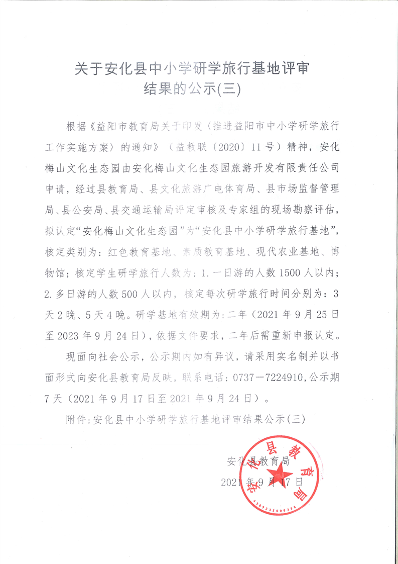 关于安化县中小学研学旅行基地评审 结果的公示(三)