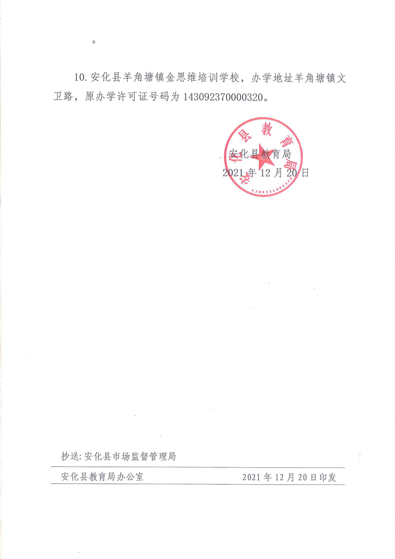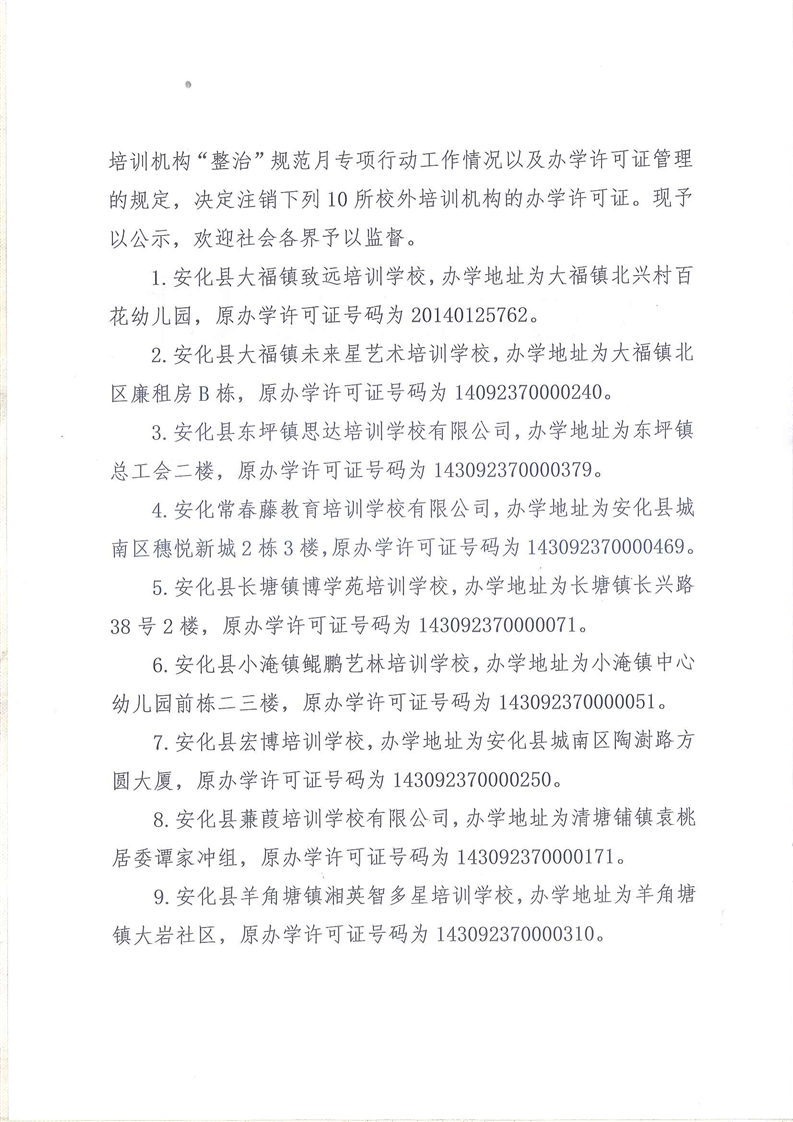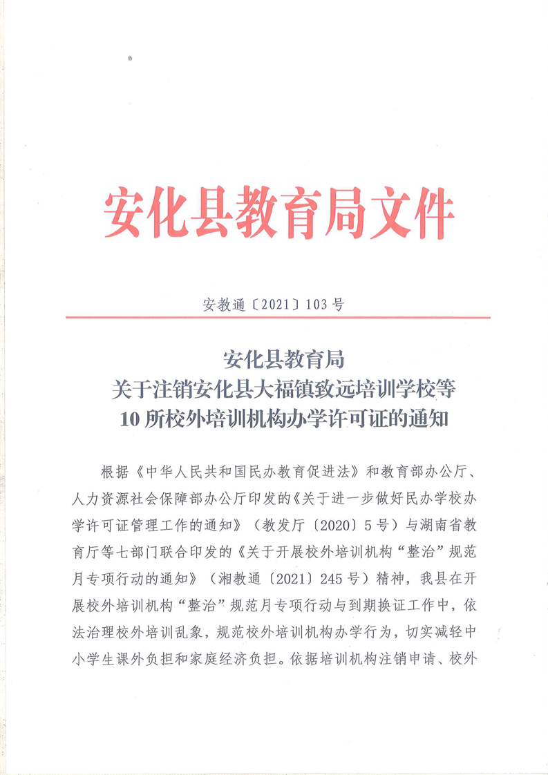 关于注销安化县大福镇致远培训学校等10所校外培训机构办学许可证的通知