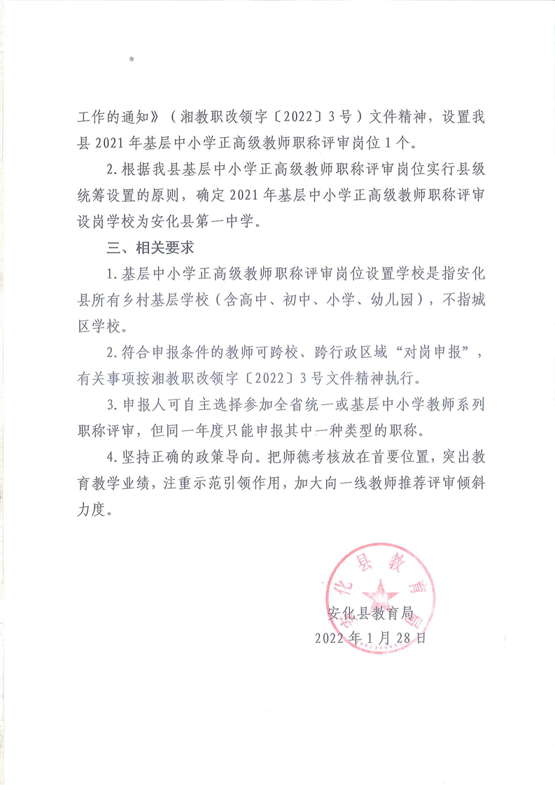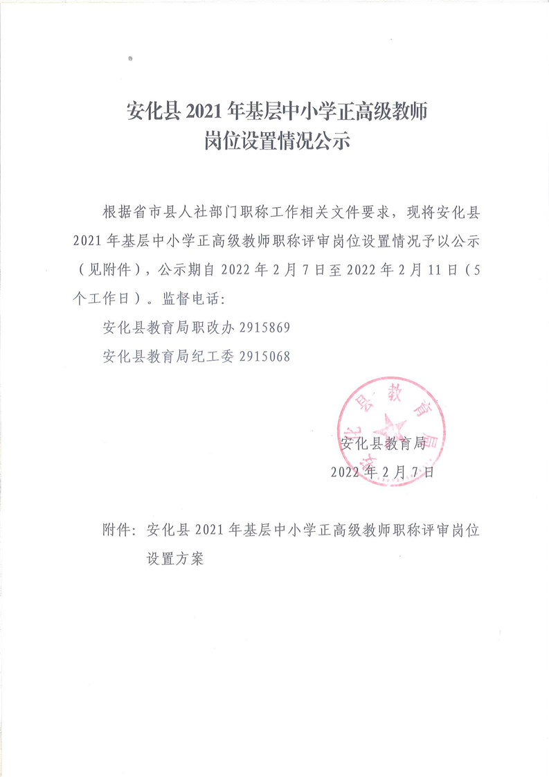 安化县2021年基层中小学正高级教师岗位设置情况公示
