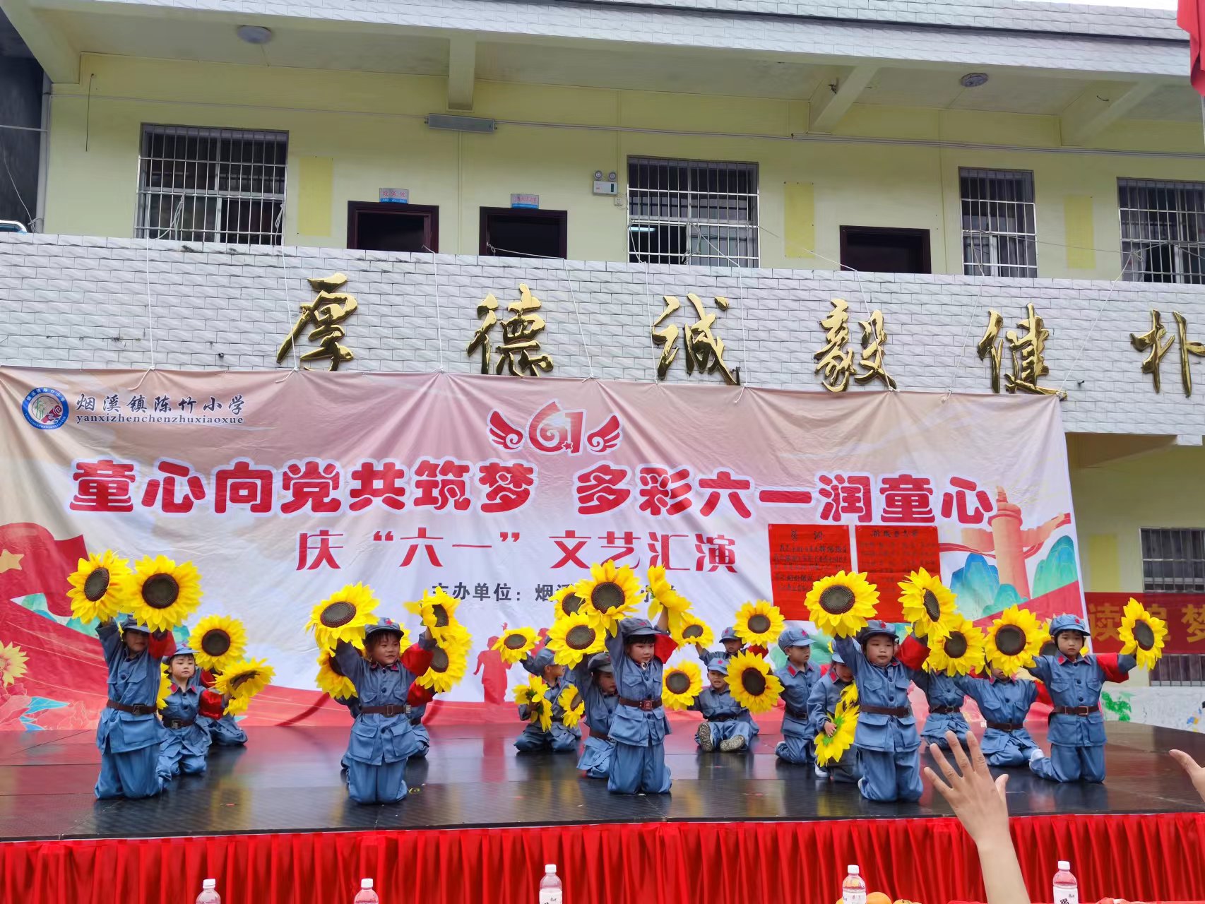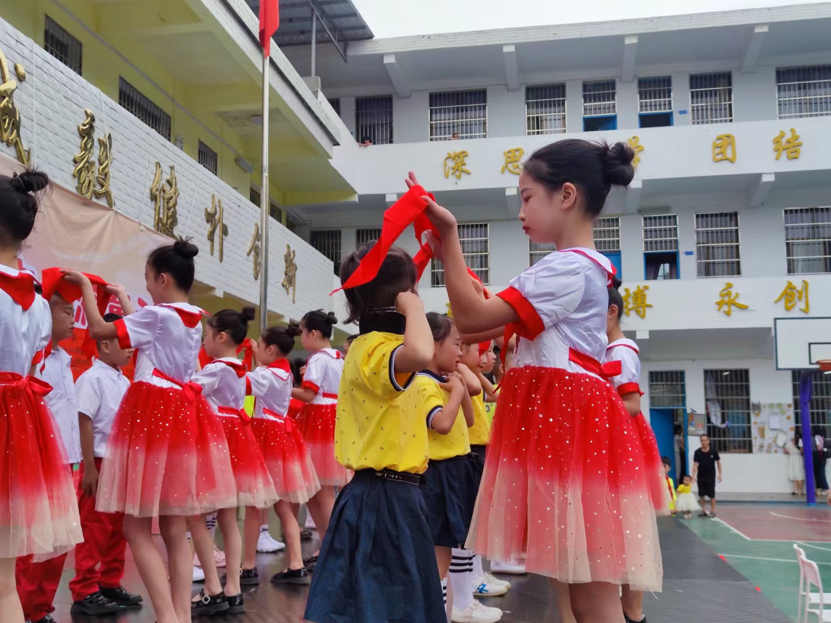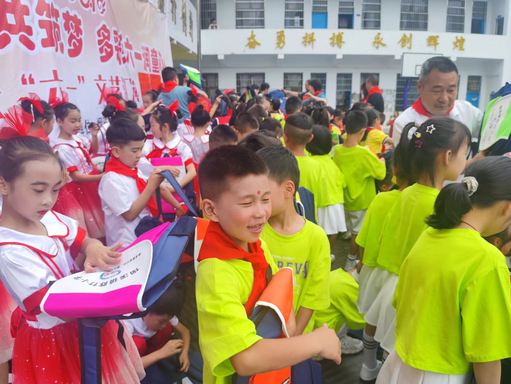 本网讯 6月1日上午,烟溪镇陈竹小学举行“庆六一文艺汇演暨新队员入队仪式活动”,烟溪镇中心校总务主任刘益顺、陈竹村党支部书记夏姣花、联合村党支部书记刘志刚、陈竹村帮扶工作队书记周荣刚和陈竹小学全体师生参与活动。 随着五星红旗冉冉升起,入队仪式正式开始。少先队辅导员夏婷宣读新少先队员的名单,新队员精神抖擞地走到队旗前。少先队代表们耐心地为新队员们系上第一条红领巾。队旗下,他们庄严宣誓,高声呼号。正式成为一名光荣的少先队员。 此次文艺汇演共11个节目,有三四年级铿锵有力的朗诵《红旗一角的故事》,有一、二年级欢快朝气的歌舞《让我们荡起双桨》《大梦想家》,有幼儿园小朋友们精彩绝伦的《舞龙舞狮》和温馨感人的情景剧《能不能不要说再见》…… 夏姣花、刘志刚代表陈竹村和联合村村民委员会为陈竹小学全体同学送上儿童节爱心书包。