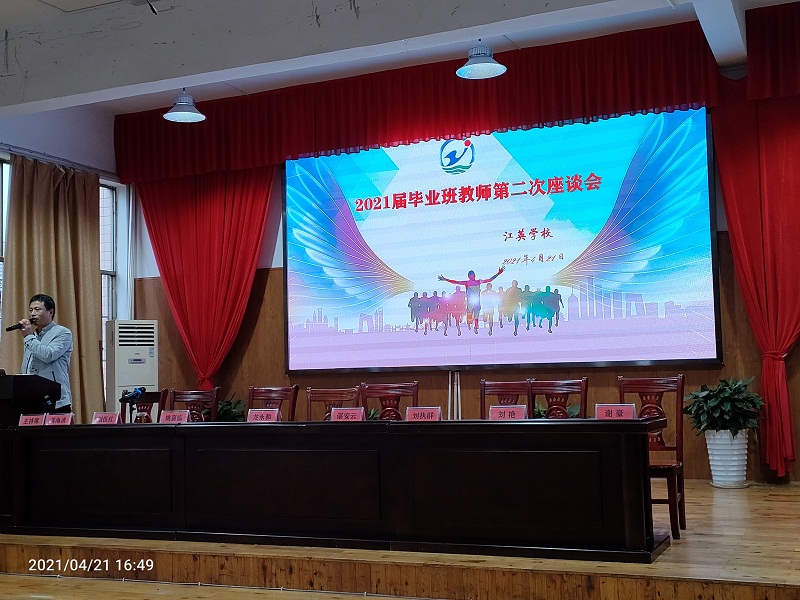 本网讯 4月21日下午3点18分,江英学校在多功能报告厅召开2021届毕业班教师第二次座谈会,全体毕业班班主任及任课教师、八年级生地学科老师、学校行政管理人员等60余人参加会议。本次会议,旨在精心研究备考策略,强化落实备考措施,对抓好2021届毕业班工作进行再动员,对全体毕业班教师进行在再鼓劲。 会议由该校办公室主任蒋海波主持。在座谈会上,中学部教科室主任刘伍红作中心发言,她以学生第一、二次模考成绩为依据,对本届毕业班作了详细的学情分析与备考方案解读,提出了切实可行的备考七措施:即“思想教育为首要、团结协作为策略、课堂教学为重点、分层辅导为突破、落实检测为强化、统筹安排更科学、重视艺体多开花、弱势学科重突破。”中学部校长姚喜临就2021年中考政策和学校毕业班奖励方案进行了解读,提出了凝心聚力促备考的总要求。学校党支部书记、校长龙永和对复习备考策略作了指导性讲话,强调各学科教师要在“反思、团队、基础、学情、重点、考试品质”等字眼上下功夫,切实抓好本届毕业班工作。督学谌安云作了会议总结,勉励与会人员“团结协作,扎实备考,不言放弃,奋力拼搏50天!”本次座谈会,既是毕业班工作第二次座谈会,也是第二次动员会、研讨会,更是鼓劲会。 5点20分座谈会结束后,理事长谢仁和率行政人员与全体毕业班教师共进了晚餐。(通讯员 王光明)