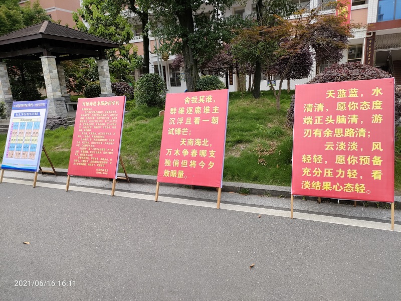 本网讯,6月16日,为确保2021年初中毕业学业水平考试工作规范、有序、顺利进行,建设“健康、公平、平稳、温馨、诚信”中考,实现零事故、零差错、零投诉的目标,江英学校精心准备周密布置考点考室,致力打造和谐温馨考点。 一是制订江英学校考点考务实施方案。2021届中考江英考点有江英、龙塘、杨林、木子、酉州、马路、奎溪共计七个单位的考生来校参考,九年级考生共计1515人,设置考室51个;八年级考生1640人,设置考室55个。今年江英考点考生多,监考人员多,考务工作量大,中考要求高。为此,学校中考工作领导小组,多次研究中考考务工作,先后两次修订江英学校考点考务实施方案,确保方案完备,以便精准实施。 二是周密布置考点。考务宣传组的王国千老师早在上一周就作出了两幅意义深远且鼓舞考生斗志的中考对联:“立鲲鹏志,写锦绣章,健笔几从容,悠游翰海;铭化雨恩,讲修齐事,惜阴当砥砺,必跃龙门。” “幼而学,壮而行,立志振家邦,征程尚远;春之华,秋之硕,培根沾雨露,风采弥新。”分别张贴于中、小学两部的校门,字迹遒劲,格外醒目。宣传组创办的考务工作宣传栏,内容丰富,有各类考务工作规章制度、考生违纪舞弊事件处理规定、考室考生学号考号对照表、考试科目与时间表等等。55个考室清扫得干干净净,教室内的班级文化建设字样实行了全覆盖,考室正前面的墙壁上统一换上了新的挂钟。 三是打造宽敞靓丽的考务办公室。考务办公室设在科技楼二楼多媒体报告厅。从考务装订桌的摆放,到考室资料袋资料的统装,考务工作人员标志牌的书写,再到考试屏蔽器等器材的检查,英语听力设备、广播系统的试用等。这里的一切,犹如作战时期的司令部或指挥部,各项准备工作都是高标准,严要求。 下午4:00,学校中考领导小组成员对考点宣传布置、各考室与考务办公室的准备情况进行了检查。(通讯员 王光明)