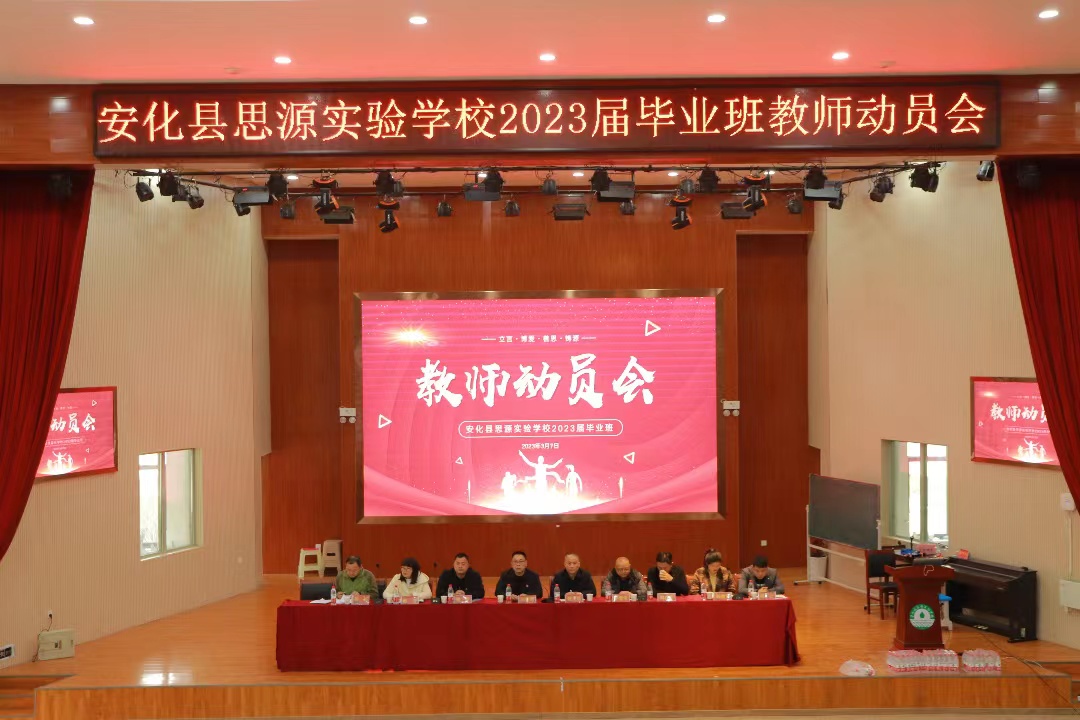 本网讯 3月7日下午,安化县思源实验学校举行毕业班教师动员会,学校管理人员和全体毕业班教师参加会议,东坪镇中心学校副校长刘飞跃出席。 在会上,该校副校长王黎明提出要更新四种理念,调动一切积极因素,确定各班目标,通过狠抓课堂教学常规提高复习效率。教务主任杨湘安解读了备考方案,宣布了行政驻科、驻班分工安排,明确了本届中考目标。九年级组长陈郁和八年级组长周云就年级现状进行了详细分析。三位班主任代表就班级管理方面进行了分享和交流,九位学科教师解读了备考方案,就本学科的复习进行了汇报。 老师们对2023届中考信心满满,都在摩拳擦掌,准备大干一场,力争教学质量再上台阶。