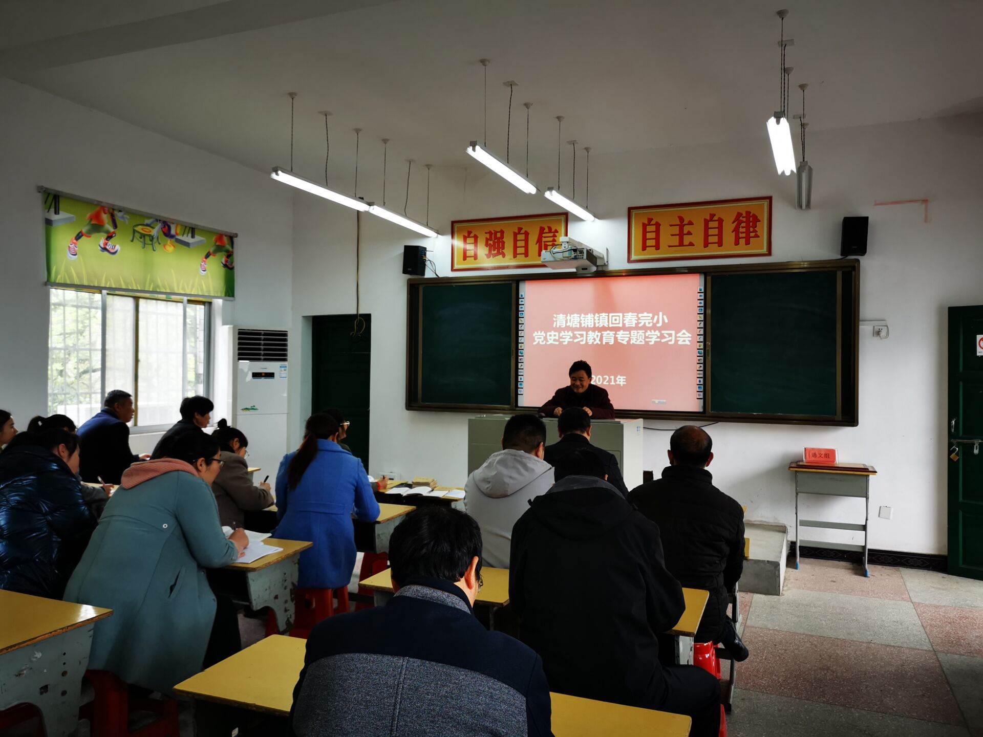 本网讯 4月15日清塘铺镇回春完小全体教师在多媒体教室召开党史学习教育“学史明理”专题学习会。