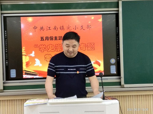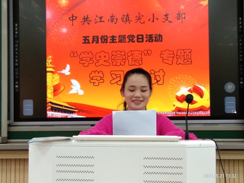 本网讯 5月21日,江南镇完小党支部举行“学史崇德,坚定信仰”党史学习教育研讨活动,全体党员和预备党员参加,党建专干朱志兵主持活动。 活动组织全体党员重温入党誓词;观看了红色视频《她把最后一颗子弹留给自己》《新时代的青春之歌》;宣传委员王立祥组织学习《中国共产党章程》之《党的组织制度》;第五学习小组李诗就“学史崇德、坚定信仰”专题发言,随后以组为单位进行了讨论交流;朱志兵安排了本月下旬党史学习内容:土地革命战争篇(10)。 活动强调,全体党员要大力弘扬党的革命传统,学习英烈,传承红色基因,做人民满意的教师,在中华民族伟大复兴的进程中建功立业。(通讯员 刘红军)