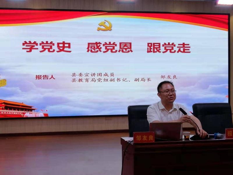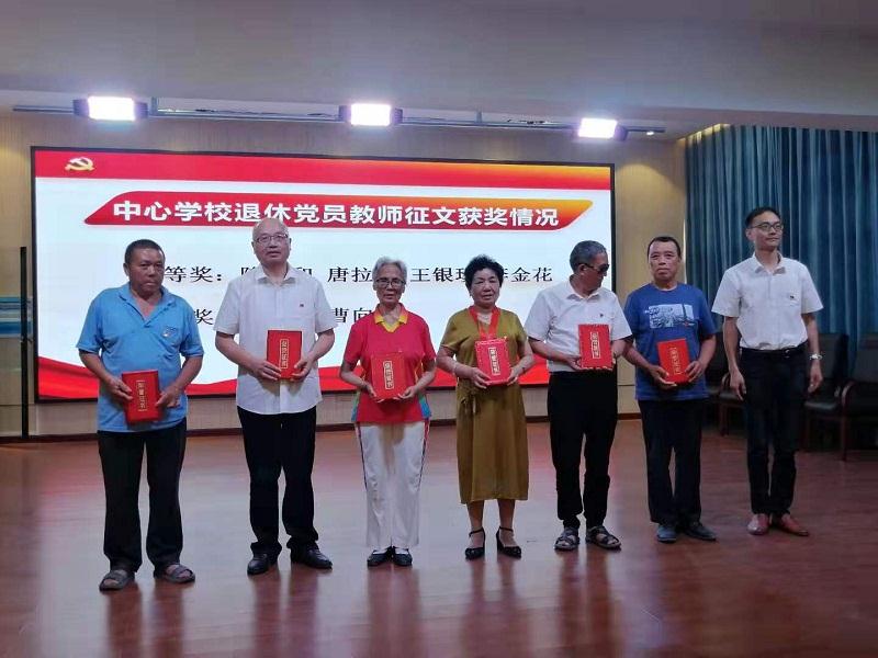 本网讯 6月26日上午,梅城镇中心学校庆祝建党100周年党员大会在梅城镇完小多功能室拉开序幕。县教育局党组副书记、副局长邹友良与全镇教育系统210名党员教师参加今天的庆祝活动。 唱红歌,颂党恩,“没有共产党就没有新中国”“党啊亲爱的妈妈”等经典歌曲催人奋进;重温入党誓词落地有声。 会上,邹友良主讲《学党史感党恩跟党走》党课,回顾中国共产党自建党以来为了中华民族的独立与解放、为了人民的幸福生活而进行浴血奋斗的光辉历程,以独特的历史视角深刻剖析了进行党史学习教育的意义。最后结合教育的实际,明确人民教师学习党史要坚持立德为本,勤修为师之德,做到立政德、守公德、明大德、严私德。党课内容丰富,叙述历史故事时情景交融,分析时政时观点精辟,获得党员们的阵阵掌声。罗习锋代表中心学校作《奋楫争先凌峰顶追梦扬帆再启航》教育工作报告。报告详细总结了100来梅城教育所取得的成绩,回望走过的路,筚路蓝缕,硕果飘香;感恩党和政府对教育的深切关怀,记得来时的路,阳光满地,党恩浩荡;描绘梅城教育发展的美好蓝图,远眺前行的路,乘风破浪,繁花似锦。 会上,邹友良还为党龄超过50年的老党员颁发了纪念章。宣读了表彰通报,对全镇教育系统36位优秀党员、2名优秀党务工作者和中心校组织的庆祝建党100周年党史知识竞答比赛、党员学习笔记评优、征文、书法、绘画、摄影比赛优秀个人受到表彰奖励。中心学校为每一位员党员赠送的节日礼品,幸福洋溢在每一人的脸上。