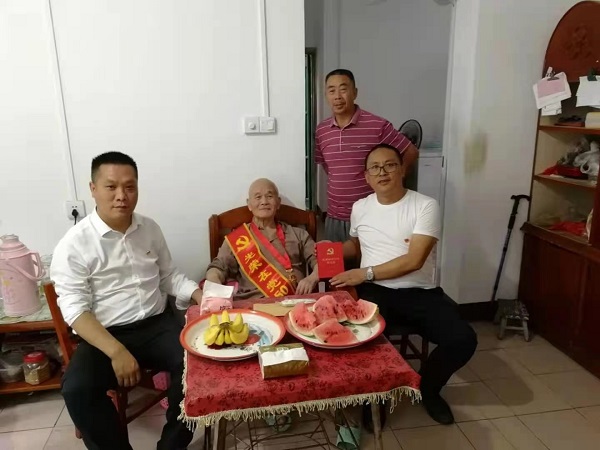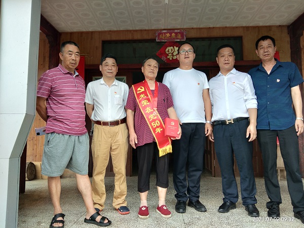 本网讯 7月2日,江南镇中心学校党总支书记陶志标一行5人,上门为党龄50年以上的老同志贺偶花、贺集勋、陶信开颁发“光荣在党50年”荣誉证书,并致以崇高敬意。