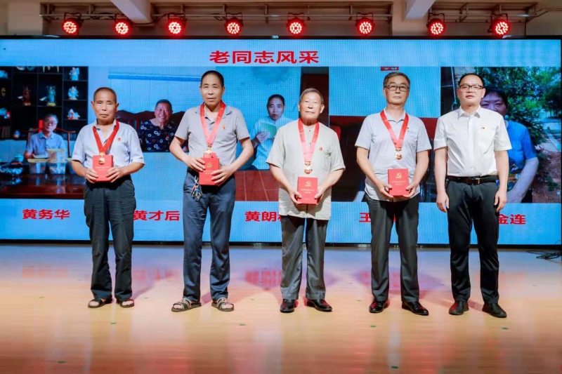 本网讯 7月1日,在伟大的中国共产党成立100周年的美好日子,龙塘乡中心学校党支部召集全乡百余教师,利用晚上时间,在中心学校大会议室隆重举办了百年党庆活动。 晚上6点58分,“五星红旗迎风飘扬,胜利的歌声多么响亮……”高昂的音乐在会场响起,幕布徐徐拉开,两位靓丽帅气的男女主持人登上舞台,宣告了庆典活动正式开始。庆典共有四个议程,首先支部书记彭小暑同志上台致辞,他简单回顾了近代以来我国所走过的历程,以一系列事实充分论证了“没有共产党就没有新中国”这个观点,对与会者来了一次很好的党史学习教育;然后全体党员面对党旗进行了庄严宣誓,再就是对五位50年党龄老同志颁发了“光荣在党50年”纪念章,最后是全体党员同志分党小组和个人两个类别进行“红心献给党 我为党妈庆生日”的唱红歌、朗诵红色经典比赛,经过近一小时的角逐,完小党小组取得集体节目组一等奖,中学、村小党小组获二等奖,个人节目黄一宽、王勋、黄颖、罗玉佩夺得一等奖,其余6位同志分别获得二等奖、三等奖。你唱歌,我朗诵,党员同志们真诚为党妈百年华诞献上了一份份简单而质朴的生日礼物,会场气氛始终活跃,人们沉浸在莫大的欢乐中。