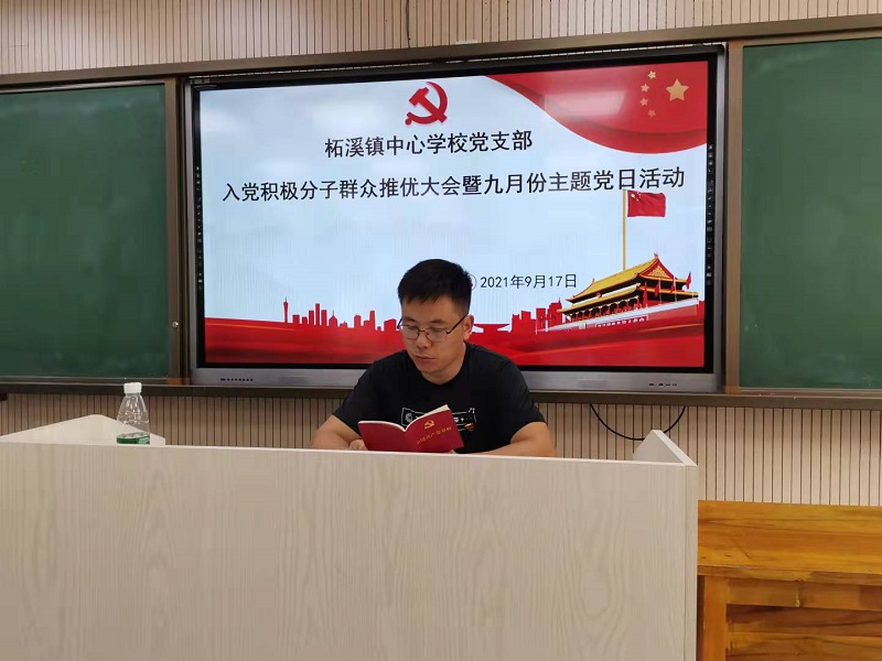 本网讯 9月17日下午,柘溪镇中心学校党支部在镇中学云录播室,召开入党积极分子群众推优大会暨9月份主题党日活动,参加会议的有党员、入党积极分子、群众代表共24人,会议由支部书记、校长刘良刚主持。 首先,全体与会人员观看党史红色微视频《孔繁森的境界感》和《国家相册:高原记录者》;接着,镇中学优秀青年教师徐爱金作思想汇报,她从自己工作和生活中的小事说起,畅谈自己对党的热爱之情,汇报了自己对党的认识,表达自己入党决心;随后,进行了无记名群众推优表决。 会议还组织学习了《中国共产党党徽党旗条例》。最后,刘良刚做总结讲话,对入党积极分子徐爱金提出了三点希望:以党员标准严格要求自己,从思想上和行动上积极向党组织靠拢;以更加饱满的工作热情投入到工作中去,发挥好模范带头作用;以更加积极的姿态加强思想交流,发挥好引领作用。同时要求各党小组要切实抓好“双培”工作,储备后备力量,全体党员要发挥先锋模范作用,在各自的工作岗位上争先创优,为柘溪教育多做贡献。(通讯员 仇一平 伍玉桥)