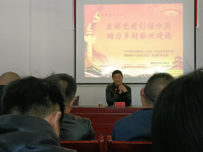 本网讯 为深入贯彻党的十九届六中全会精神,建立健全城乡基层党组织互帮互助机制,以党建联建为动力,全面提高农村基层党组织领导农村经济社会发展的能力,提升农村基层党建工作整体水平,助力乡村振兴建设。11月10日,烟溪镇中心学校党总支部与县局第二党支部、双龙村党支部联合开展“发挥党建引领作用 助力乡村振兴建设”主题党日活动活动伊始,大家集体观看了党史红色视频《党的力量来自组织》《百年誓言20210813》,重温了入党誓词。接着,县局第二支部支部书记龙冬梅组织学习了《湖南省宗教事务条例》,要求全体党员准确把握我国宗教工作面临的新形势新特点。然后,县局党组副书记、副局长邹友良上了一堂“弘扬伟大建党精神”为主题的优秀党课。最后,县教育局党组书记、局长刘唐业对本次党日活动做了精彩点评及指导性发言。