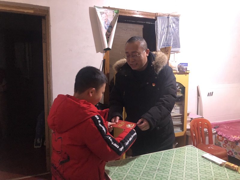 本网讯 2月7日年味还浓,冰雪未消,泥埠桥完小党支部书记蒋军一行来到贫困学生谭博家走访,并送去新春的慰问。